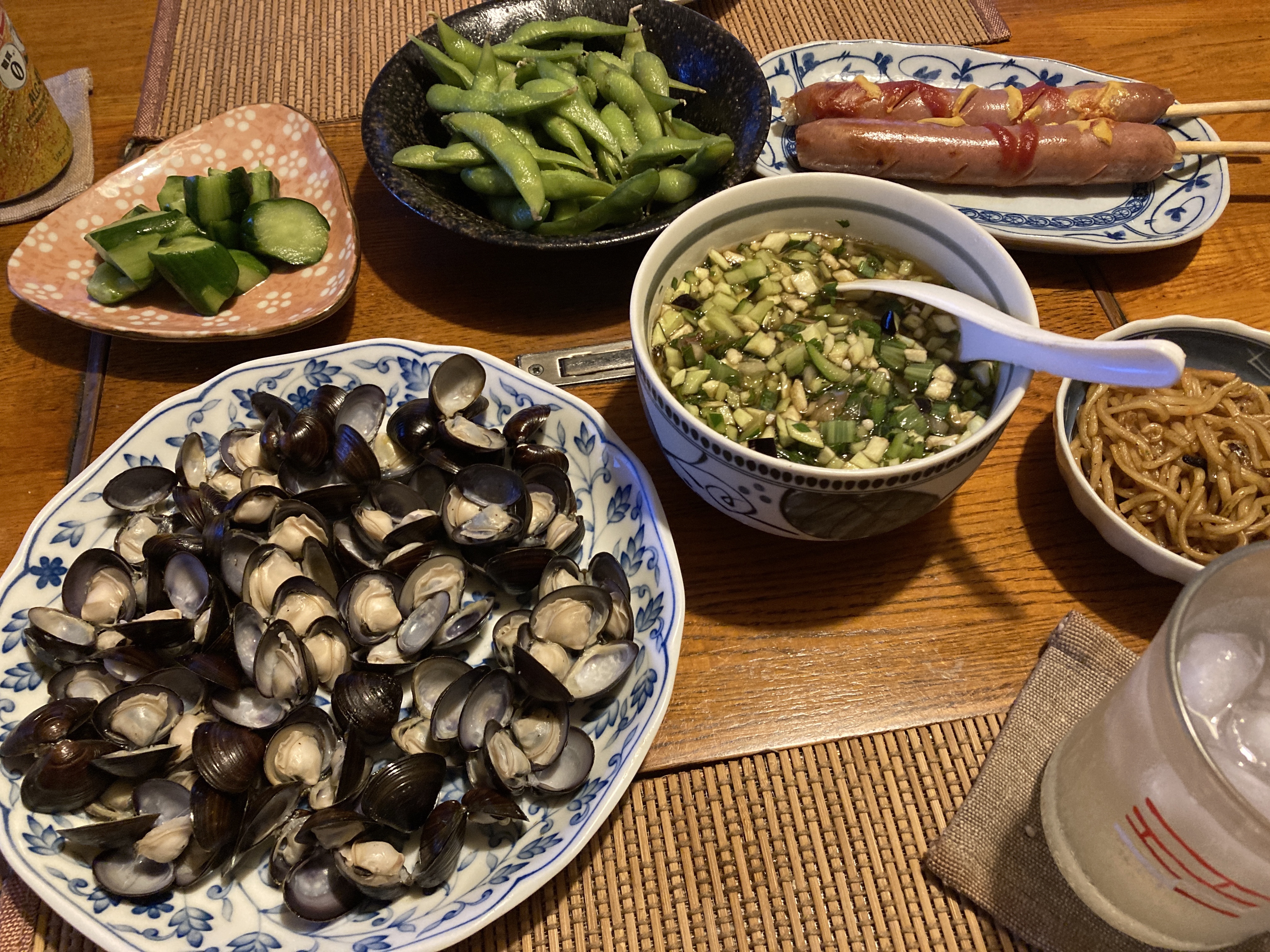 2022年7月25日blogyoko 私だけ 土曜の丑の日に青森のお客様から活きしじみが どっさり届きました。 さっそく砂抜き開始ですが、うっかり放置 して、旨みまで抜いてしまったようです。 8時前に帰宅の相棒と夕食開始。 お土産と酒蒸しのしじみとダシが食べたくて 私だけダシかけご飯で〜す。