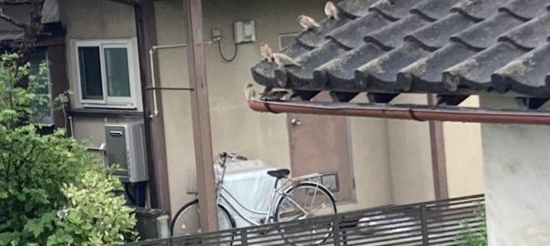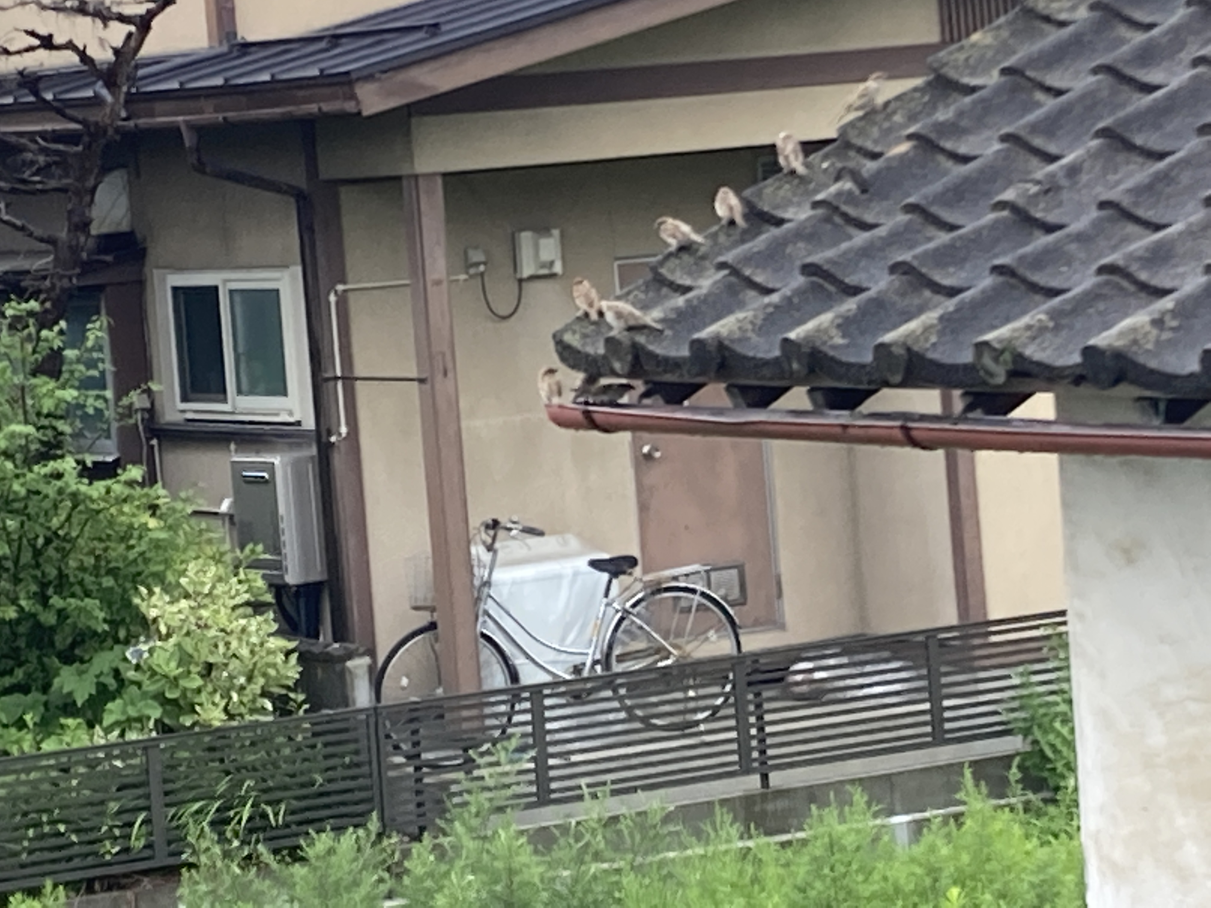 2022年7月22日blogyoko 雀が 事務所に来て窓を開けたら、とにかく賑やか。 後ろの家の石瓦で雀が井戸端会議中のようです。 パチリをした時点でかなり飛んでいったので 半分くらいしか写っていませんが。 そして次々飛んで行き静かになりました。