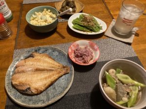 2022年10月17日blogyoko 口喧嘩 肉系が続いていたので夜は焼き魚と芋煮。 芋煮が出ると我が家は必ず口喧嘩です。 私はキノコやこんにゃくを入れたい人。 健康面でもダイエット面でも。 というか当然と思うのですが、相棒は 牛肉と里芋と白ネギだけにして欲しい、と。 次回からいつものように煮て、盛り付けに 気をつける事にします。 どこにも出掛けずとも畑と家の中で動いて それなりの歩数で〜す。