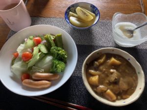 2022年10月18日blogyoko 来週からは 相棒が起きて来ないので朝散歩中止です。 寝心地最高で起きられなくなっています。 私はモップをかけたり外の枯葉掃除したりで いつも通りの時間を過ごします。 いつもの朝食です。 朝カレーが2週続いているので、さすがに 来週からはやめようかと思っていま〜す。