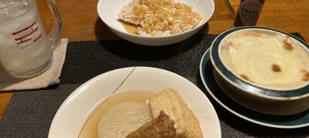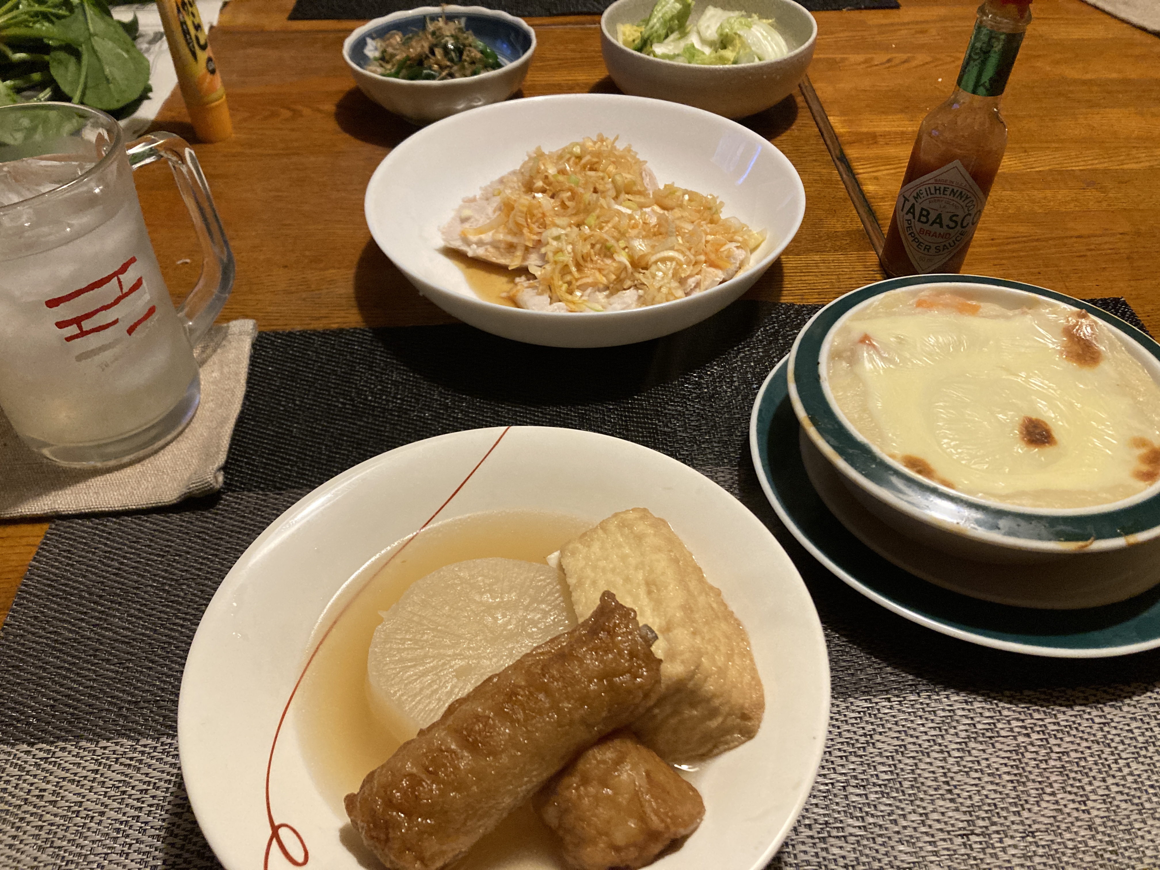 2022年12月19日blogyoko 自給自足の 夕食におでんの材料が足りませんでしたが、 おでん大根を煮込んでみました。 あとは胸肉にネギのドレシングをたっぷり かけて。 自給自足の大根とネギ、美味しいで〜す。