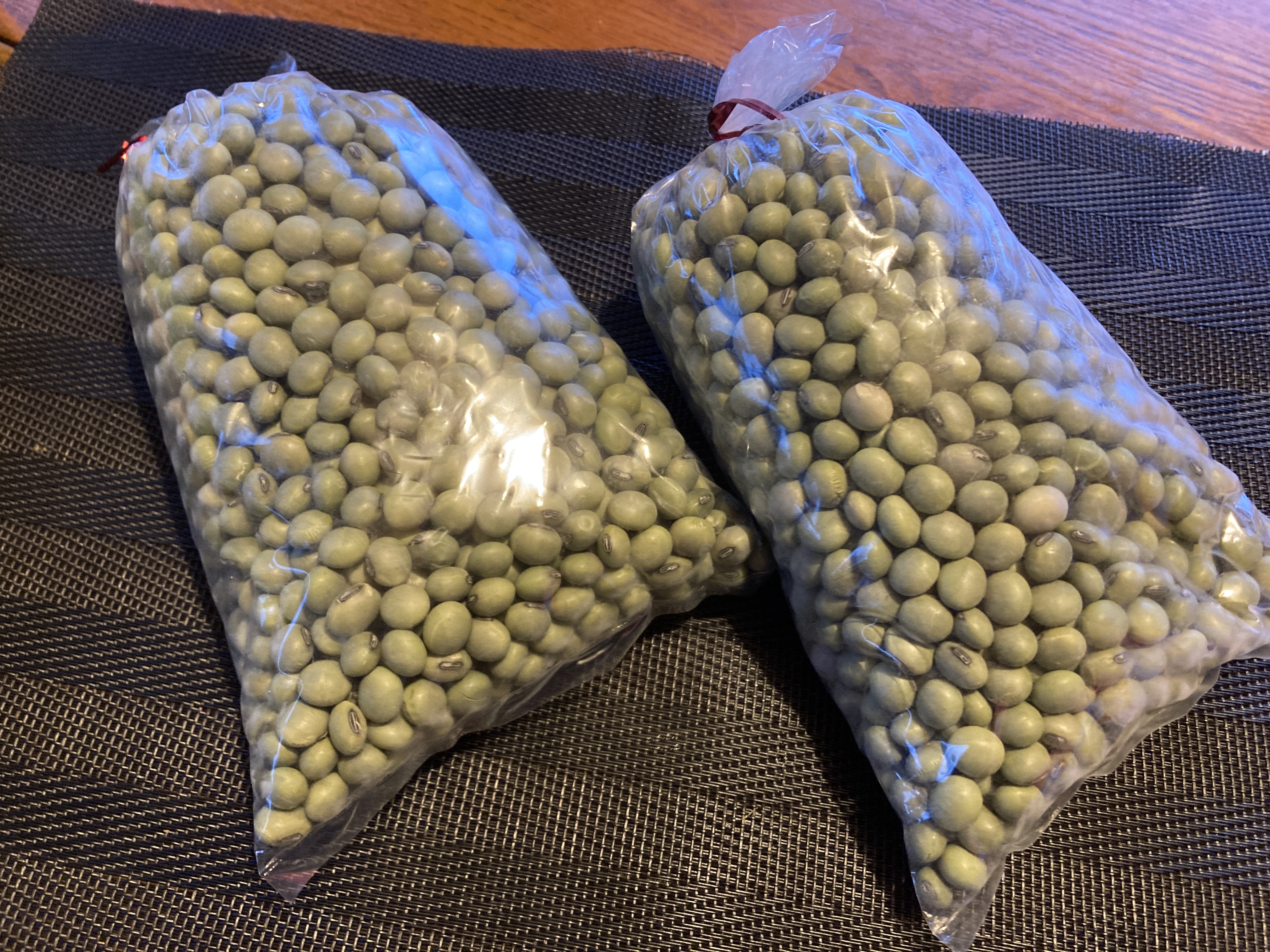 2022年12月23日blogyoko 青豆 昨日の夕方に長井から知人が来社です。 青豆をたくさんいただきました。 正月用にそろそろ購入しようと思って いました。 今年は孫ちゃん達もこないのでおせちも 作る予定はないし、冷凍庫の在庫処分の 予定ですが、さすがに数の子豆だけは 食べたいのでラッキーで〜す。