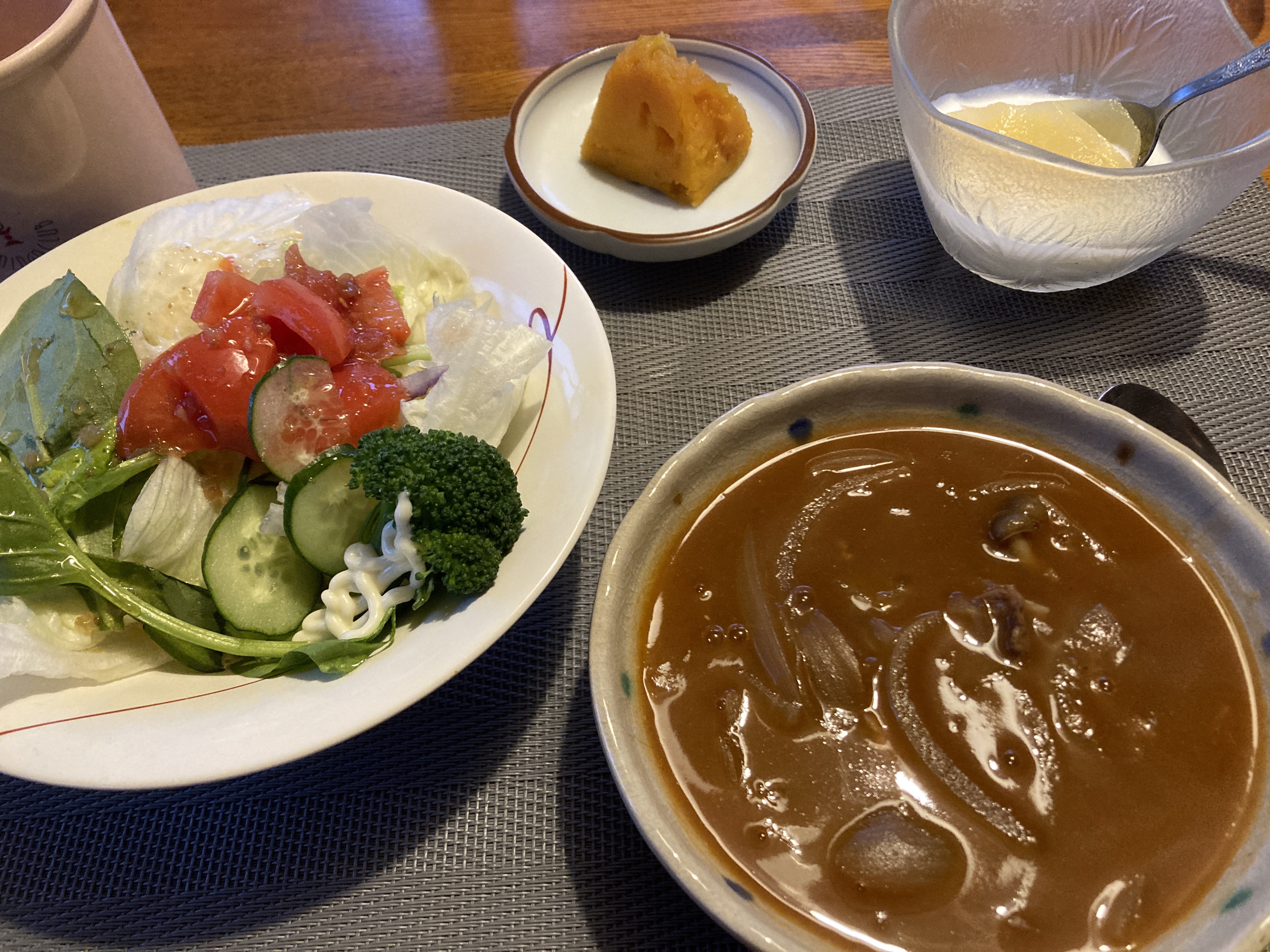 2022年12月22日blogyoko 冬至 朝食はトマトのハヤシ。 暖房兼ねて朝準備したのはいいけど分量を 間違えて完全にスープ状態です。 そして一口だけのかぼちゃ。 今日は冬至なので煮てみました。 砂糖なしの薄口醤油のみ。 それでも、あとは食べない宣言の相棒で〜す。