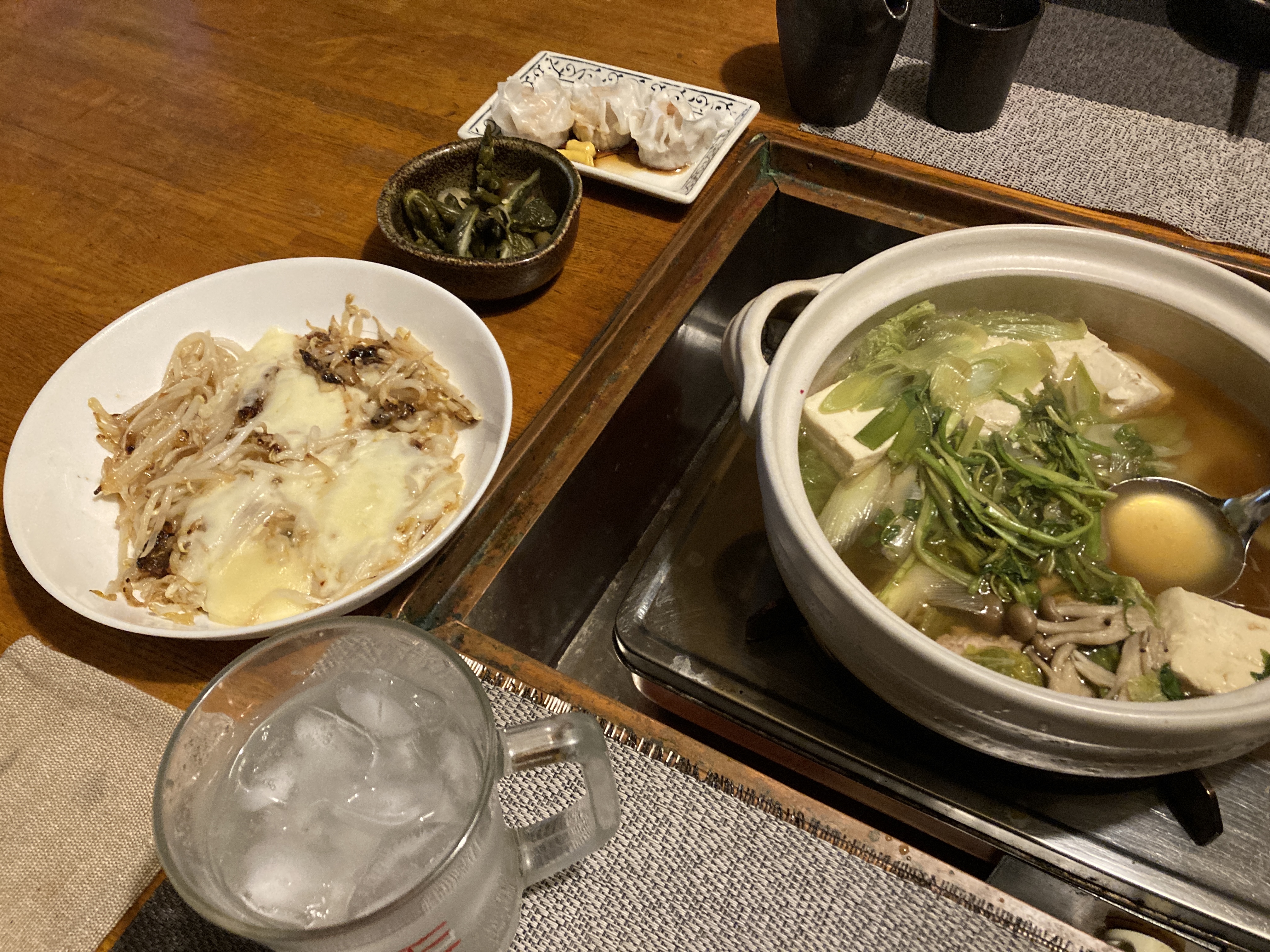 2023年1月18日blogyoko 好評 相棒の誕生日ですが、帰宅が遅くなる連絡が 入ったので日にちをあらためて買い物もせず ジムから帰宅です。 セリ鍋とネットで見たもやしのチーズのせの 夕食です。 もやしに片栗粉、コンソメ、みりんを入れて ごま油を入れたフライパンで焦げるまで両面を 焼いてチーズをのせて、とけたら出来上がりの 超簡単メニューです。 見た目は悪いけで、相棒から好評で〜す。