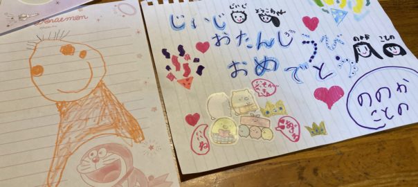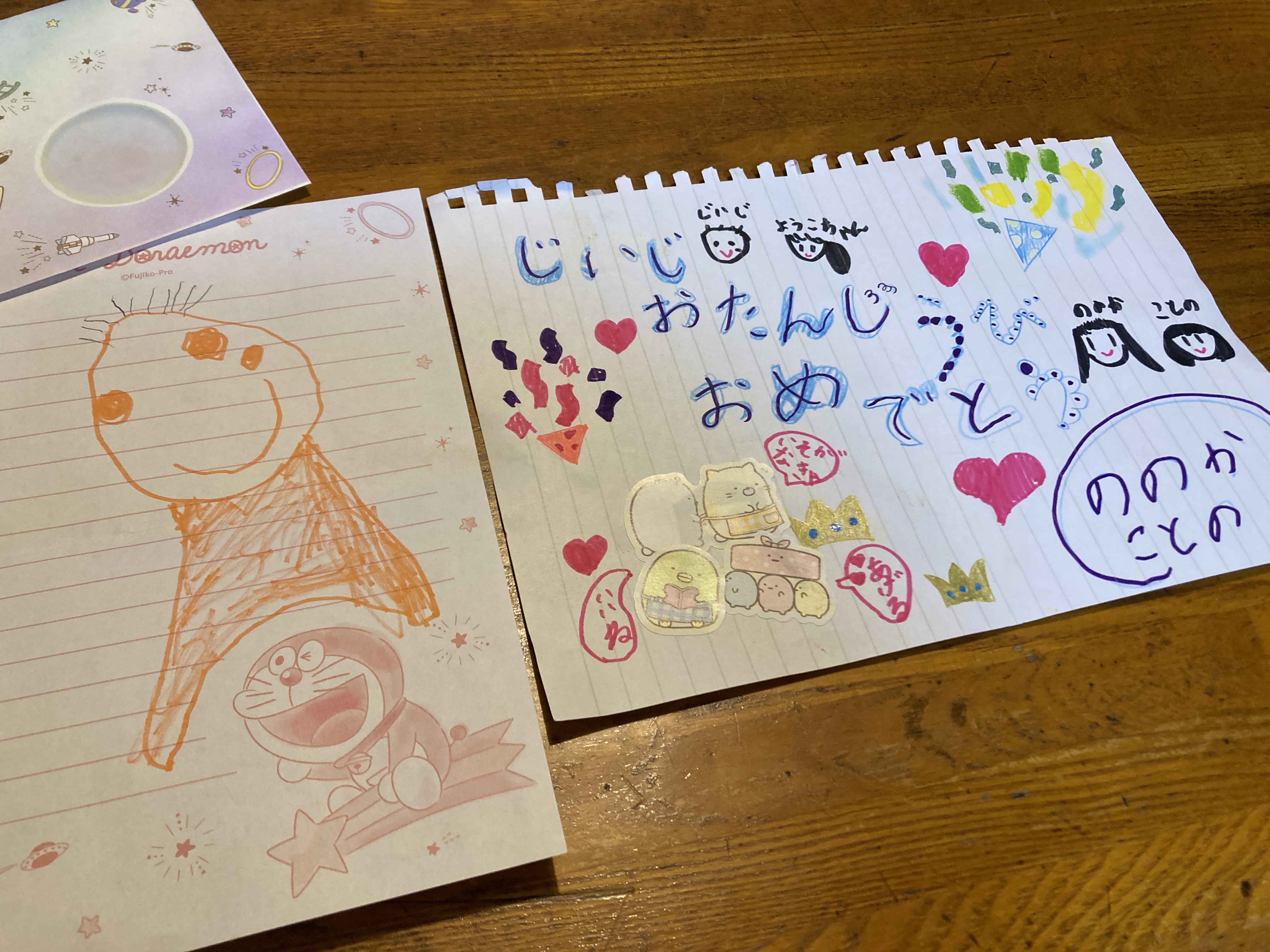 2023年1月27日blogyoko 中止 孫ちゃんからじいじへ。 誕生日当日にテレビ電話で見ていましたが ママが郵送してくれました。 二人とも相棒の特徴をしっかり捉えています。 ホクロがある事、髪の毛がない事。 当日はよく見れていなかったか、見た瞬間 吹き出してしまいました。 本当はこの週末会いに行くつもりでしたが、 義弟の入院と寒波で中止で〜す。