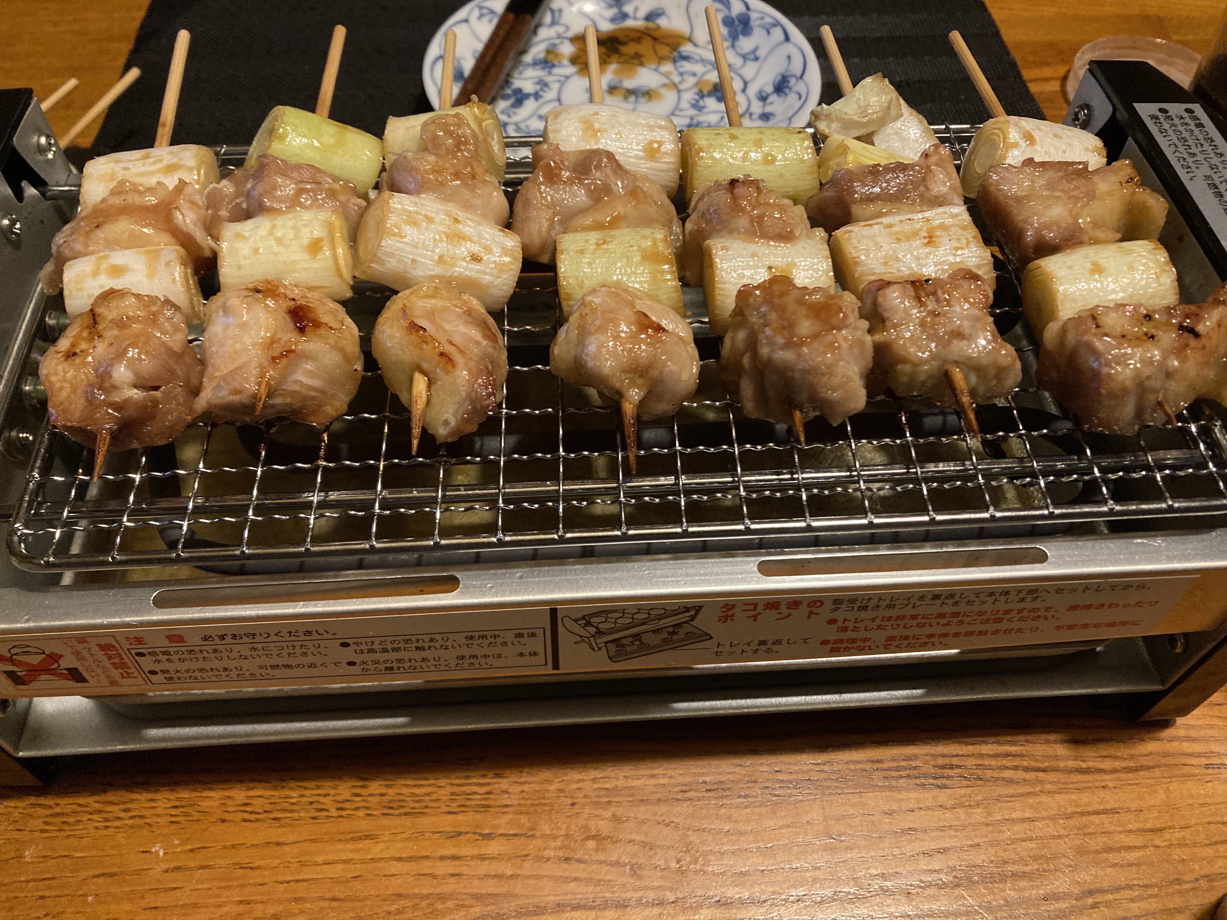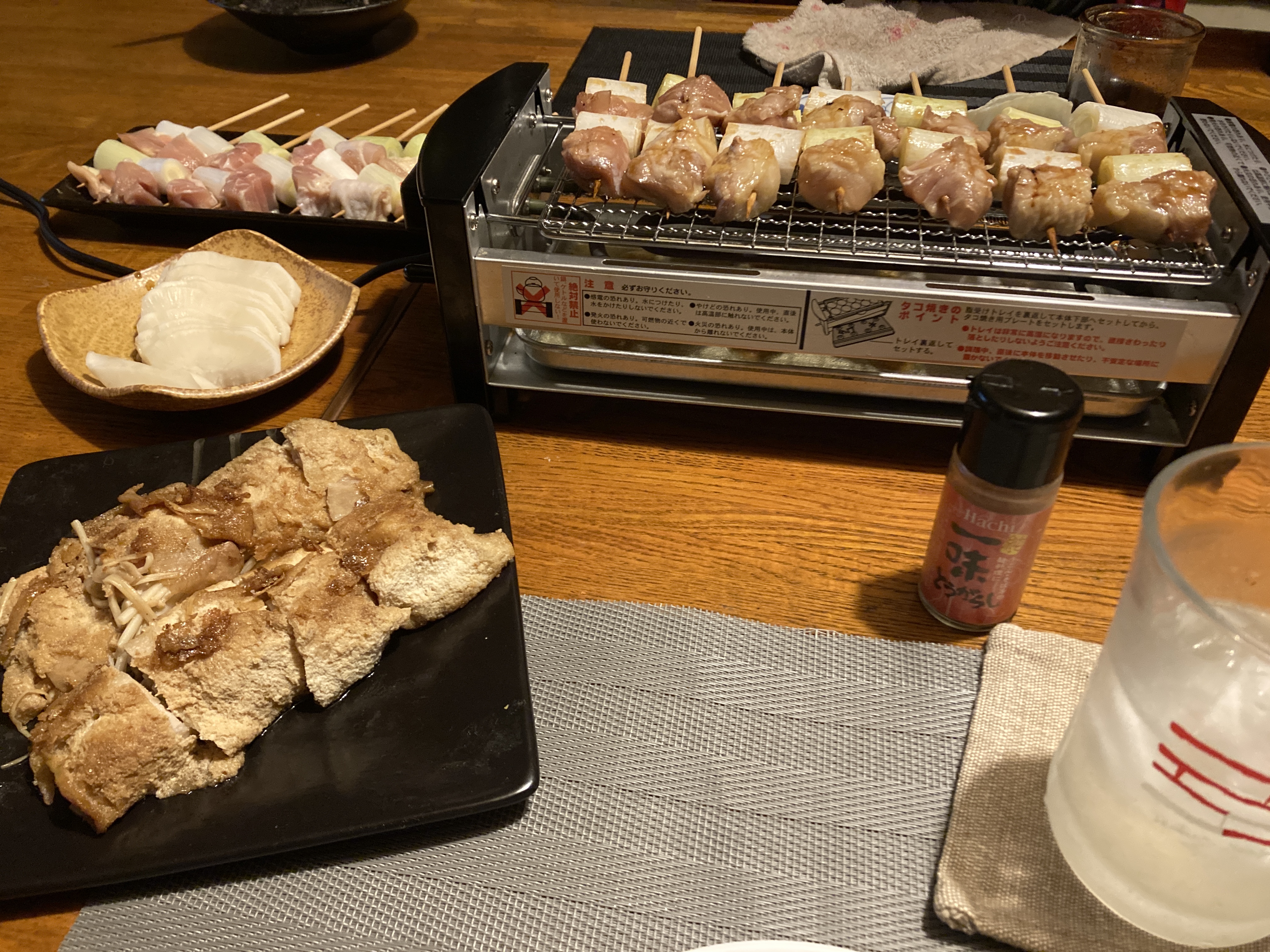 2023年2月13日blogyoko 失敗作 ジムに行く前に準備していたので戻ると すぐに焼きとりの夕食です。 ネットで見た油揚げを裏返ししたものに豚バラと エノキを巻き巻きにしてタレを絡ませたのは 失敗作になってしまいました。 焼くのは相棒なので私は焼き上がるのを 待つだけの身で〜す。