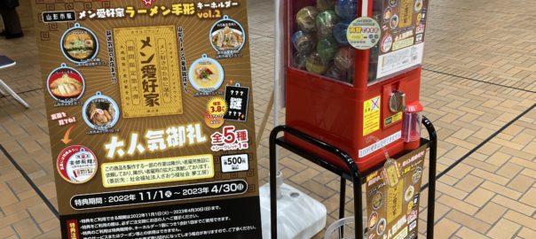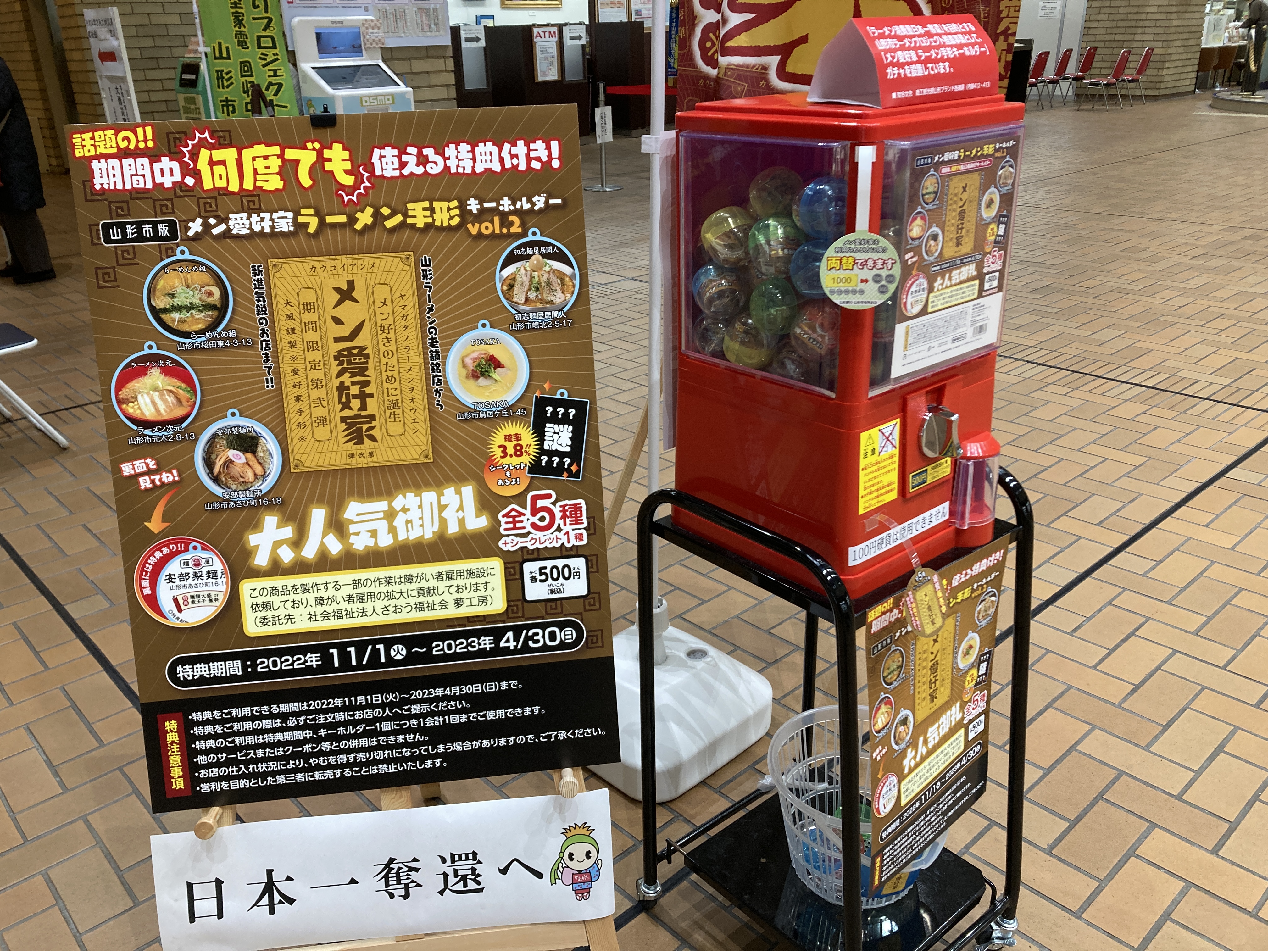 2023年2月3日blogyoko ラーメン日本一 市役所の2階で用事を済ませて降りてきたら ホールに伝統神輿です。 ラーメン手形のキーホルダーも。 1回500円のガチャです。 お店にこのキーホルダーを見せると特典が あるらしいです。 山形がまたラーメン日本一になるよう頑張って いま〜す。
