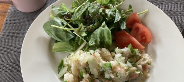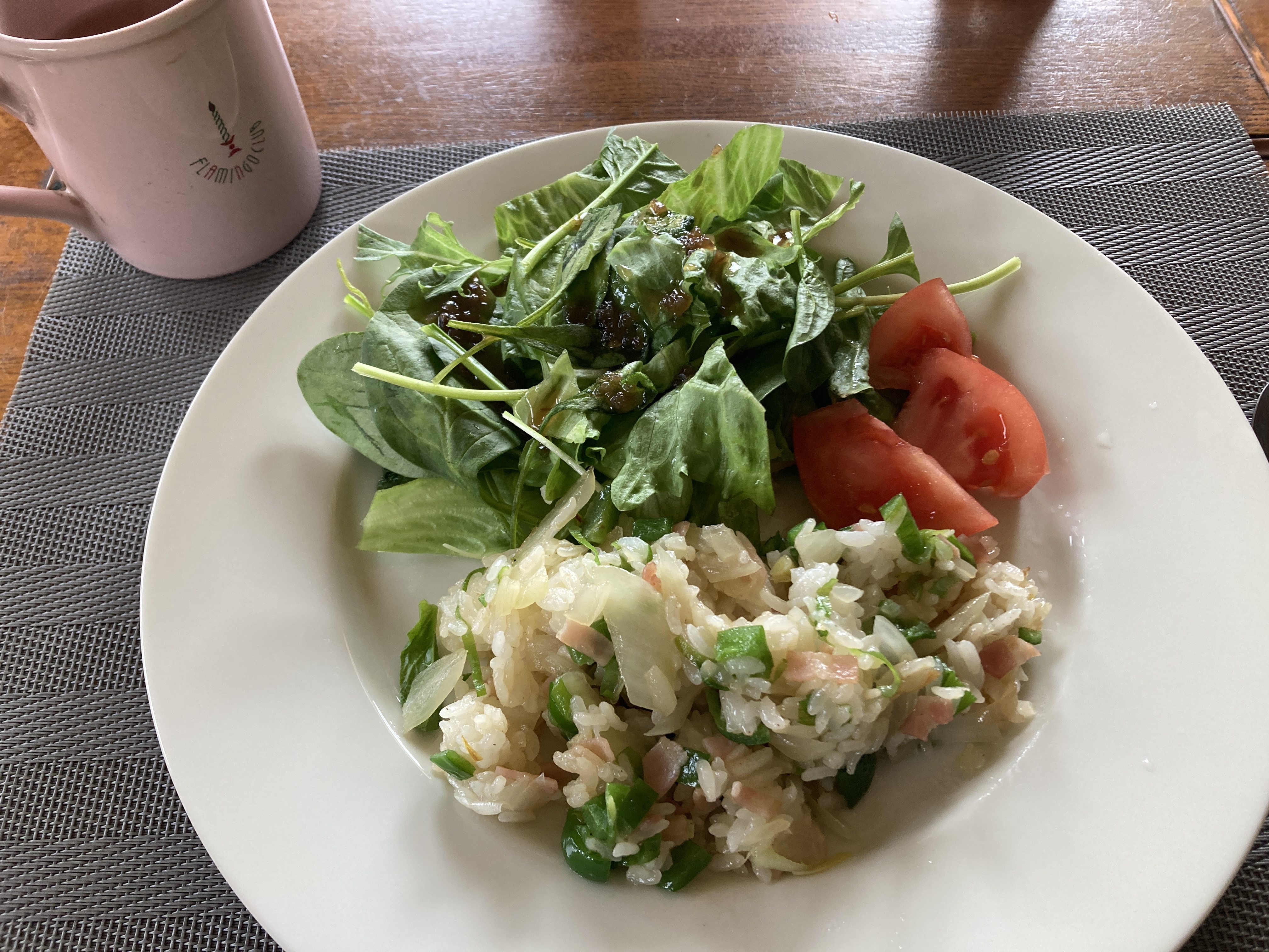 2023年3月20日blogyoko この量で とりあえず午前中で片付けが終わったので 今度は畑へ。 前日のみぞれがまだ残っていて何もできません。 お昼は相棒のリクエスト醤油味の炒めご飯。 午前中にたくさん動いたのでお腹ペコペコですが 相棒が控えめになっているので、この量で 我慢で〜す。