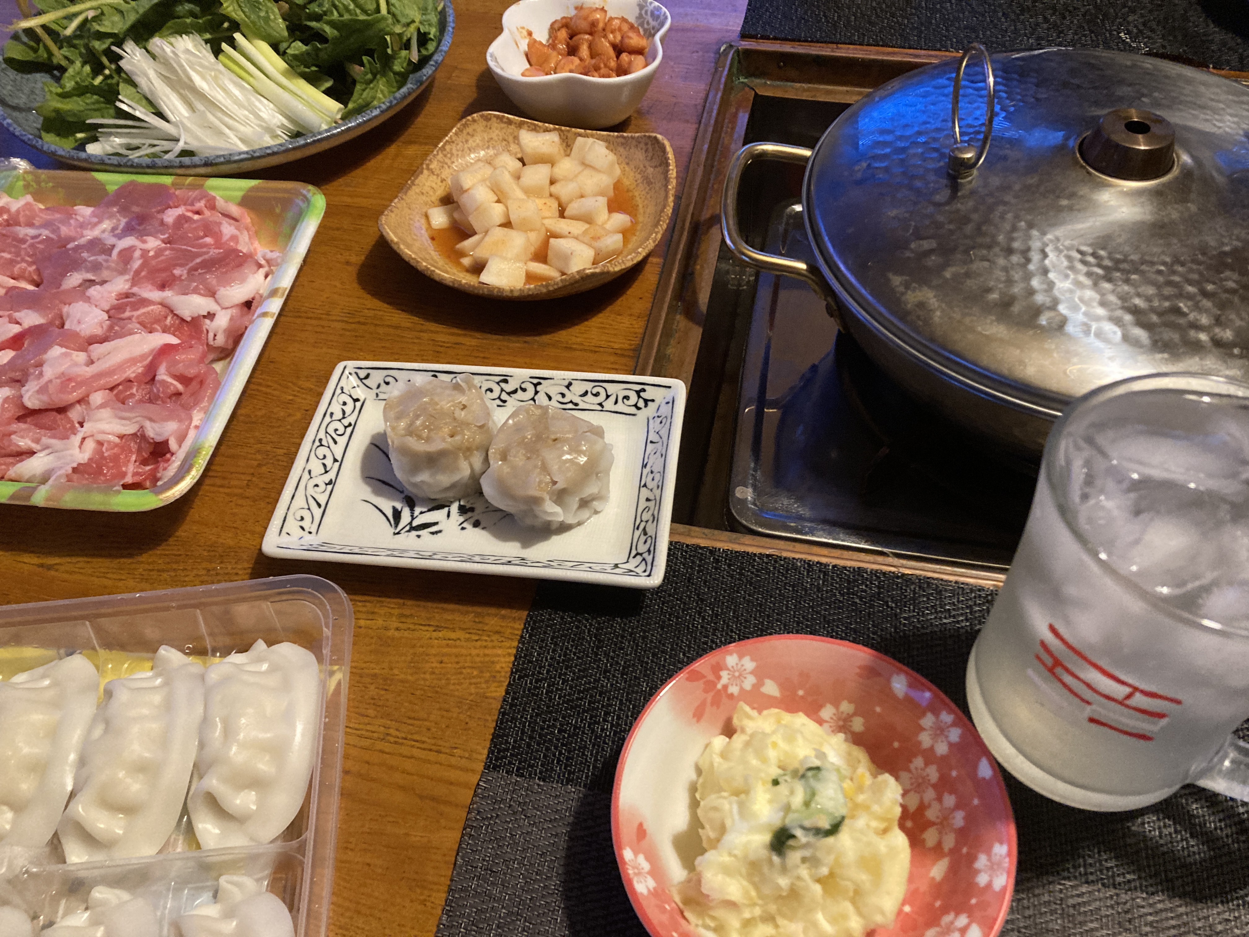 夕食は我が家の最後のほうれん草でしゃぶ。