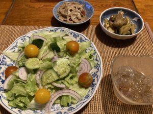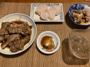 さっぱり煮を温めて、あとはホタテのお刺身。