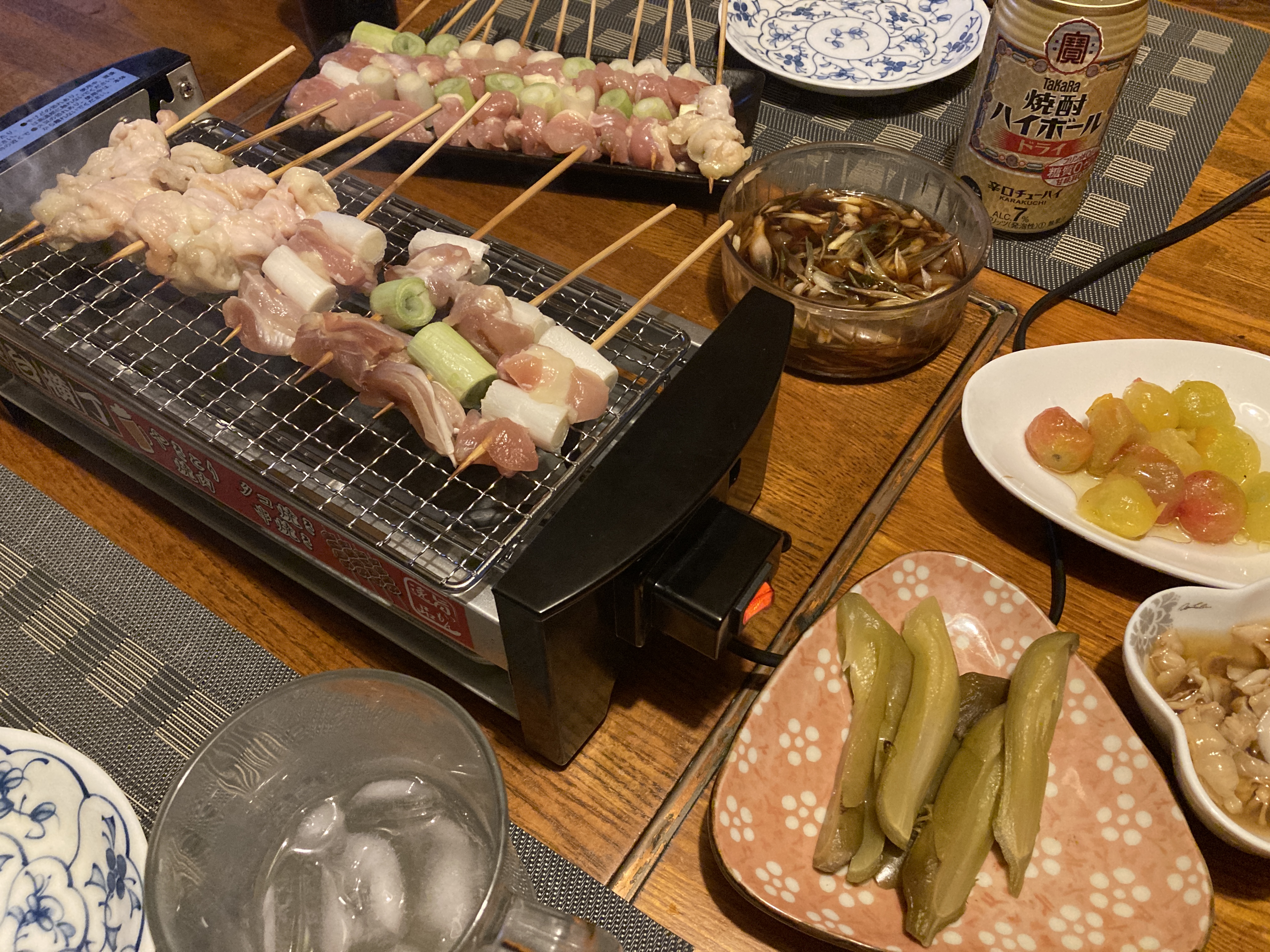 2023年8月29日blogyoko 食べる前に 朝のうちに準備していたので帰ると すぐに焼き鳥夕食の開始です。 焼き鳥奉行がいるので、中々食べるまで 時間がかかります。 タレを三度つけて焼かないとOKが出ません。 その間、酎ハイがゴクゴク喉を通るので 食べる前にお腹がいっぱいで〜す。