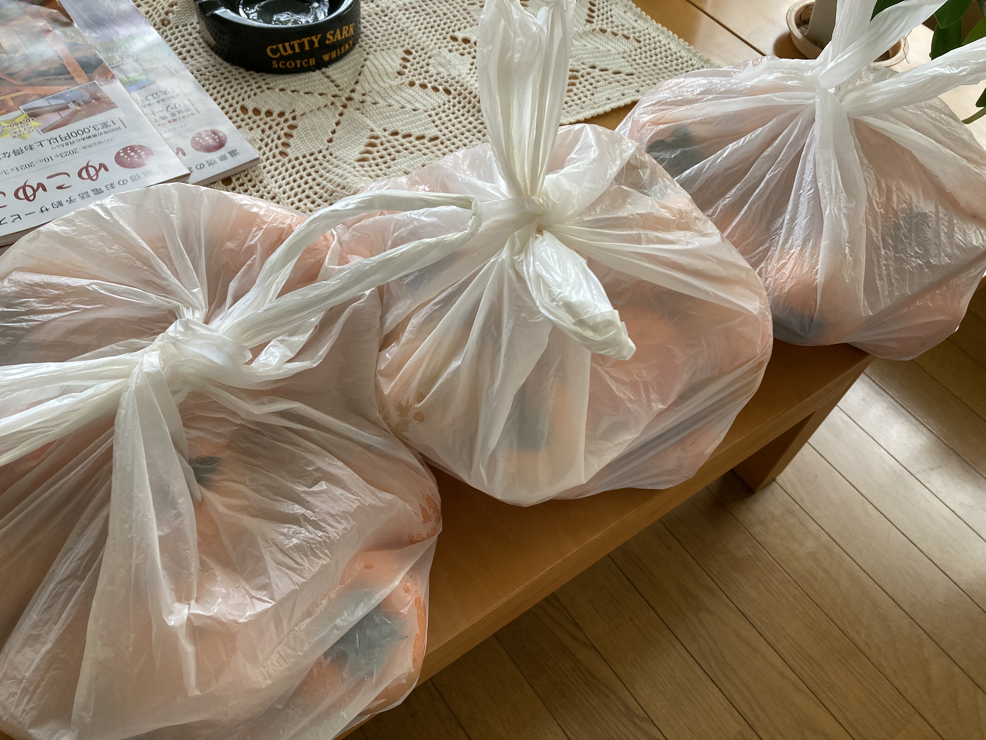 2023年10月30日blogyoko 今は 先週に漬けた柿の渋が抜けたのでスタッフ分 袋に入れて準備。 そして、また柿を漬けて 3箱の行き先を考えて漬けています。 前は一度にいっぱい漬けて食べきれずの 失敗を生かして、今は1週間おきに 渋抜きをしていま〜す。