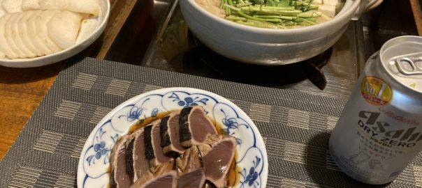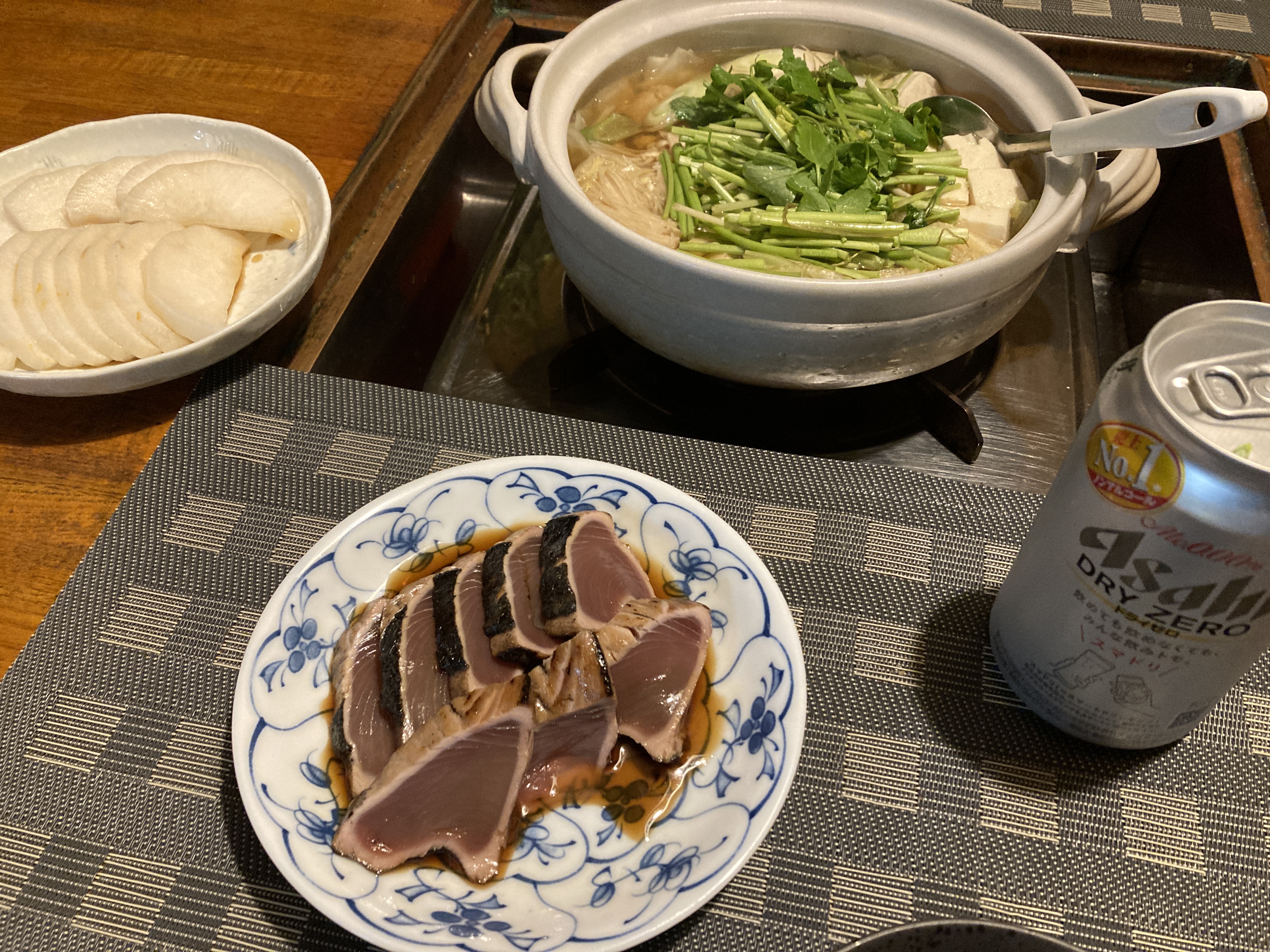 夕食もなるべく消化の良いセリ鍋と鰹のタタキ