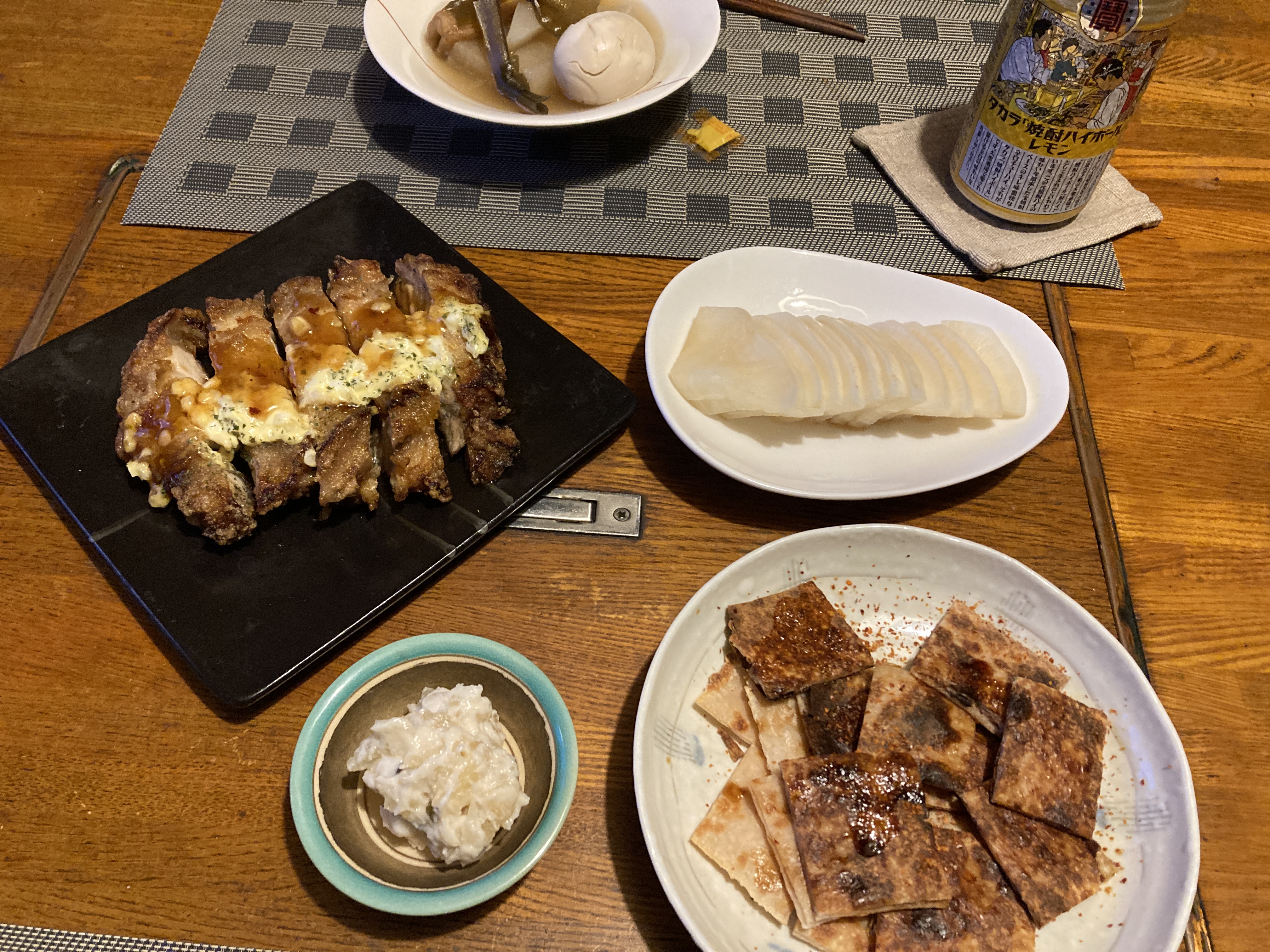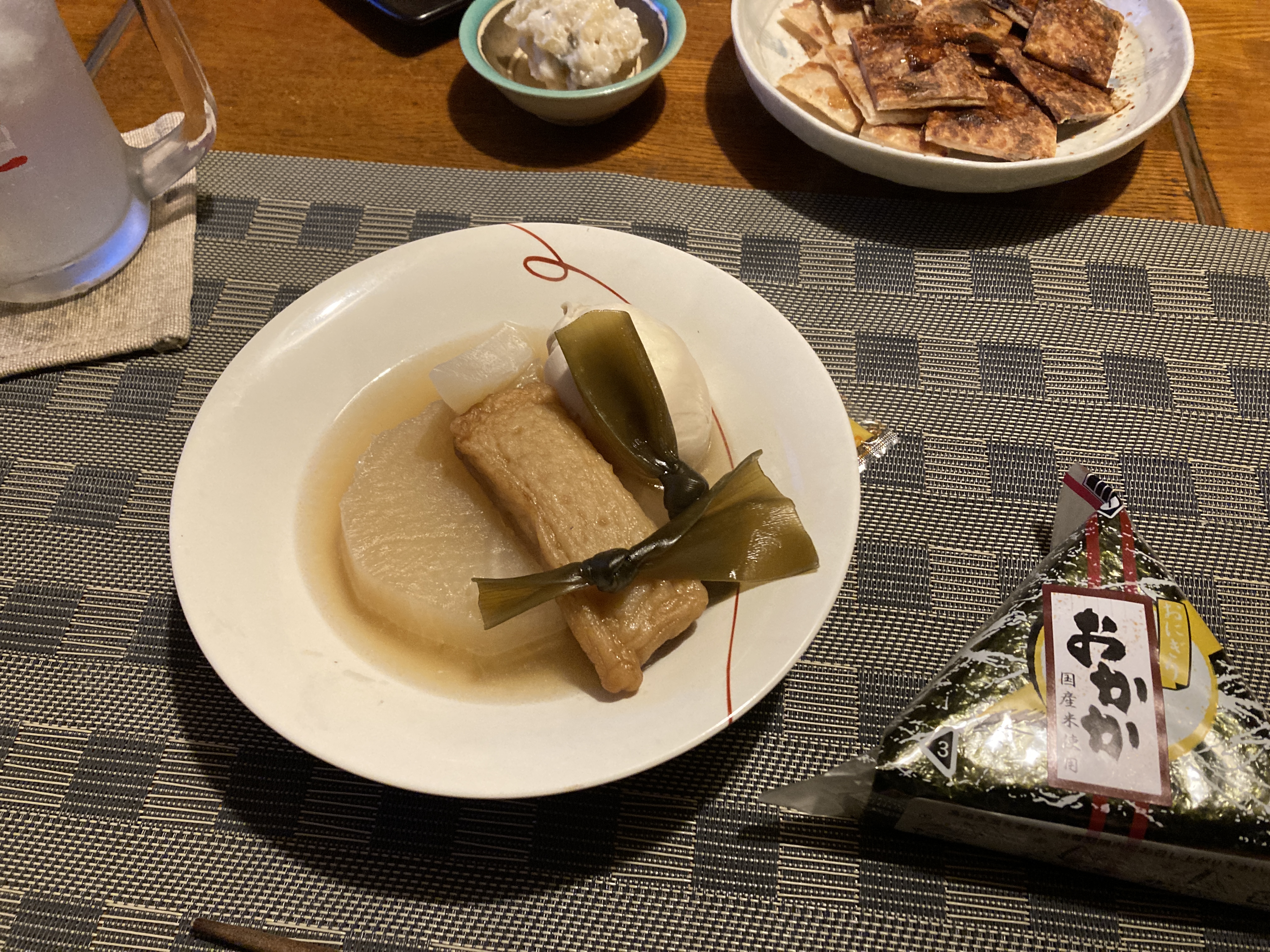 2023年12月22日blogyoko 残すわけにも 夕食はあぶった酒粕とチキン南蛮。 あとはおでんとお昼用に買っていたおにぎり。 うっかり忘れてお昼にラーメン食べてしまい、 また残すわけにもいかずで〜す。