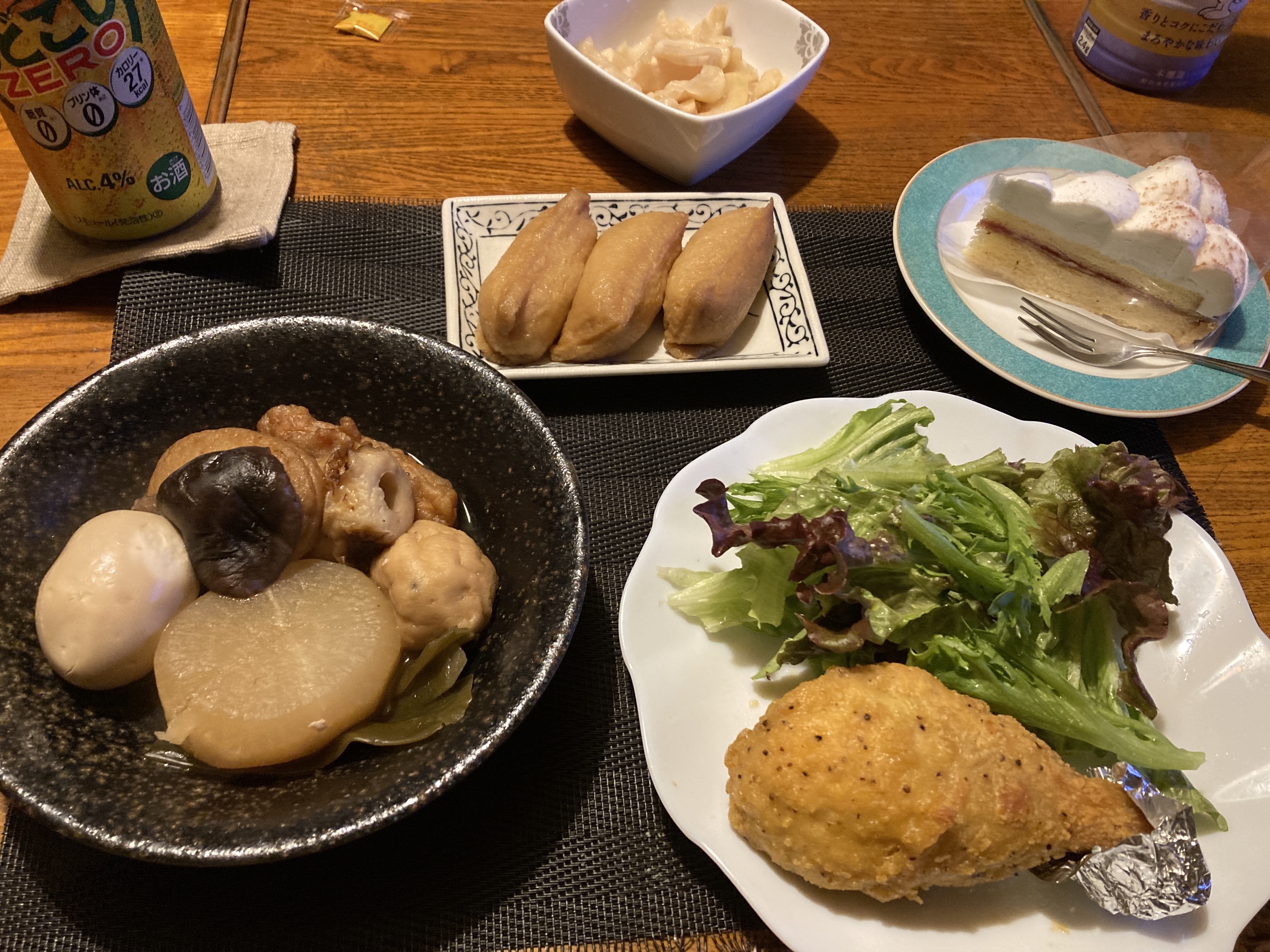 2024年1月18日blogyoko 仕切り直し お誕生日の相棒に何かご馳走を作ろうと 思ってはいたのですが、、、。 リフォームで家がゴタゴタしているのと 事務の引き継ぎで頭と体がついて いきません。 相棒の好きなチキンと稲荷&チーズ ケーキをスーパーで購入しただけ。 おでんは前日から作ってあったので ついでに並べただけ。 私の誕生日も近いので、二人分一緒に 仕切り直しで〜す。