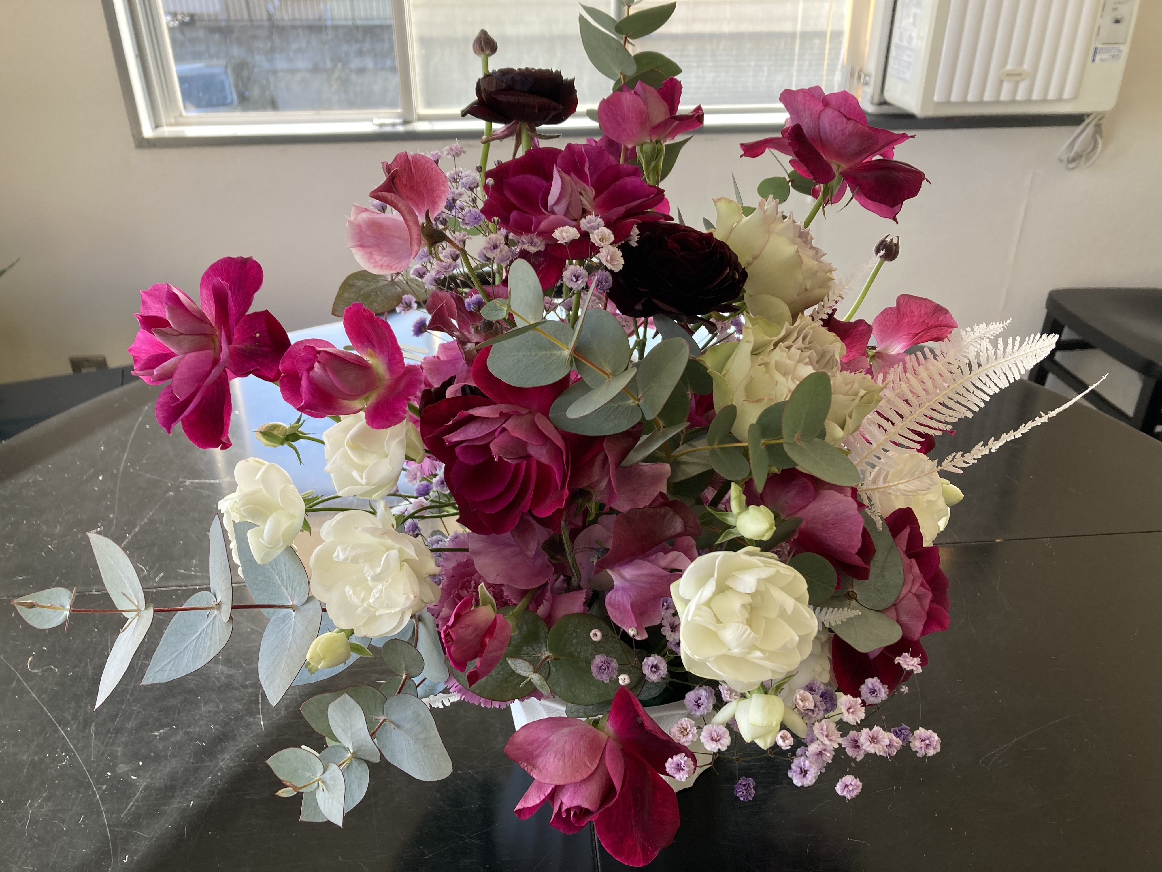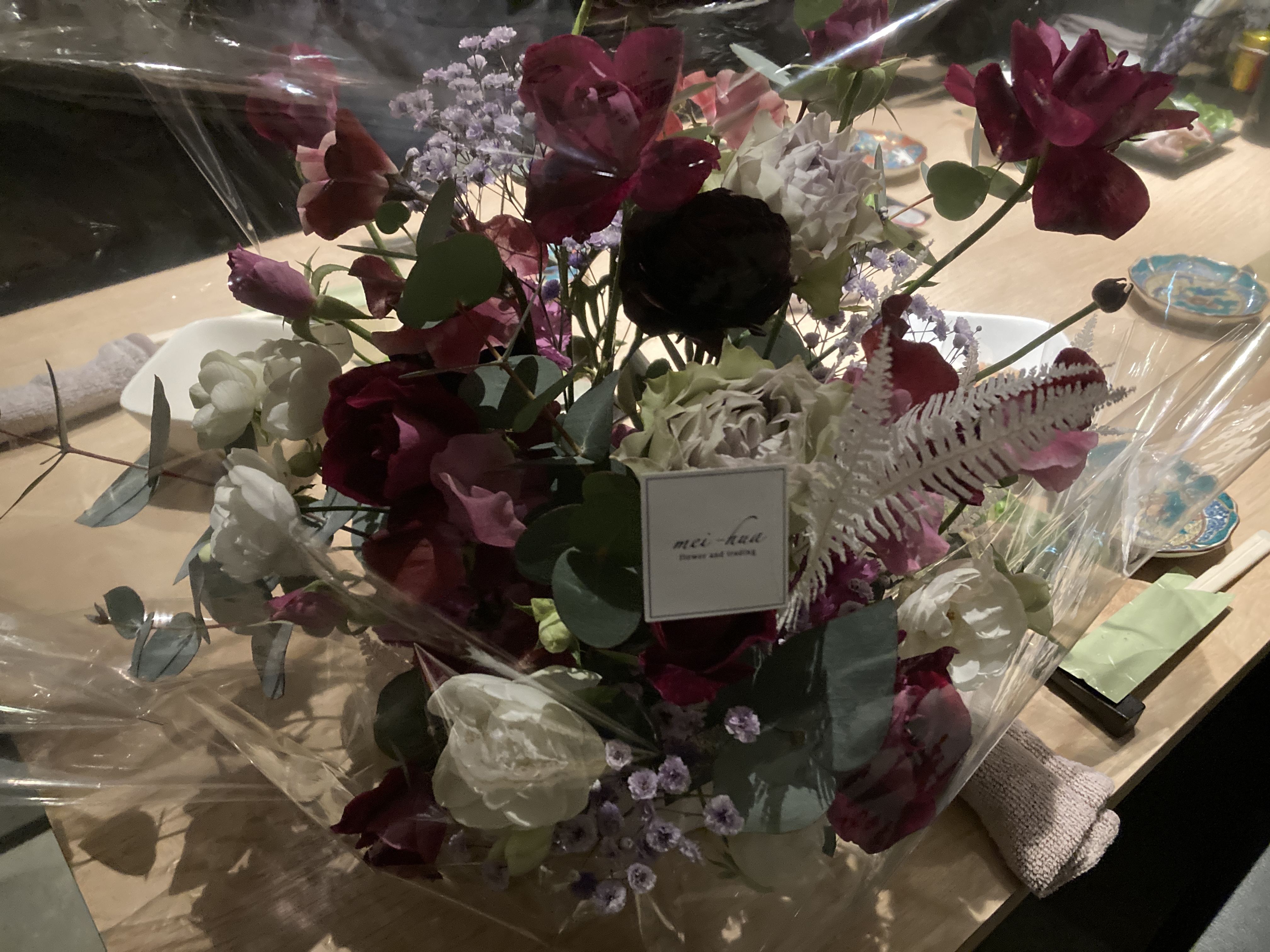 2024年1月29日blogyoko フラワーアレンジ 金曜の夜は新人の歓迎会、私の送別会 スタッフの役員就任等全てを含めての 飲み会でした。 そして私へアレンジです。 今リフォーム中でせっかくいただいても 置く場所もないので事務所へ持参です。 フイルムを外したら、素敵なフラワー アレンジで〜す。