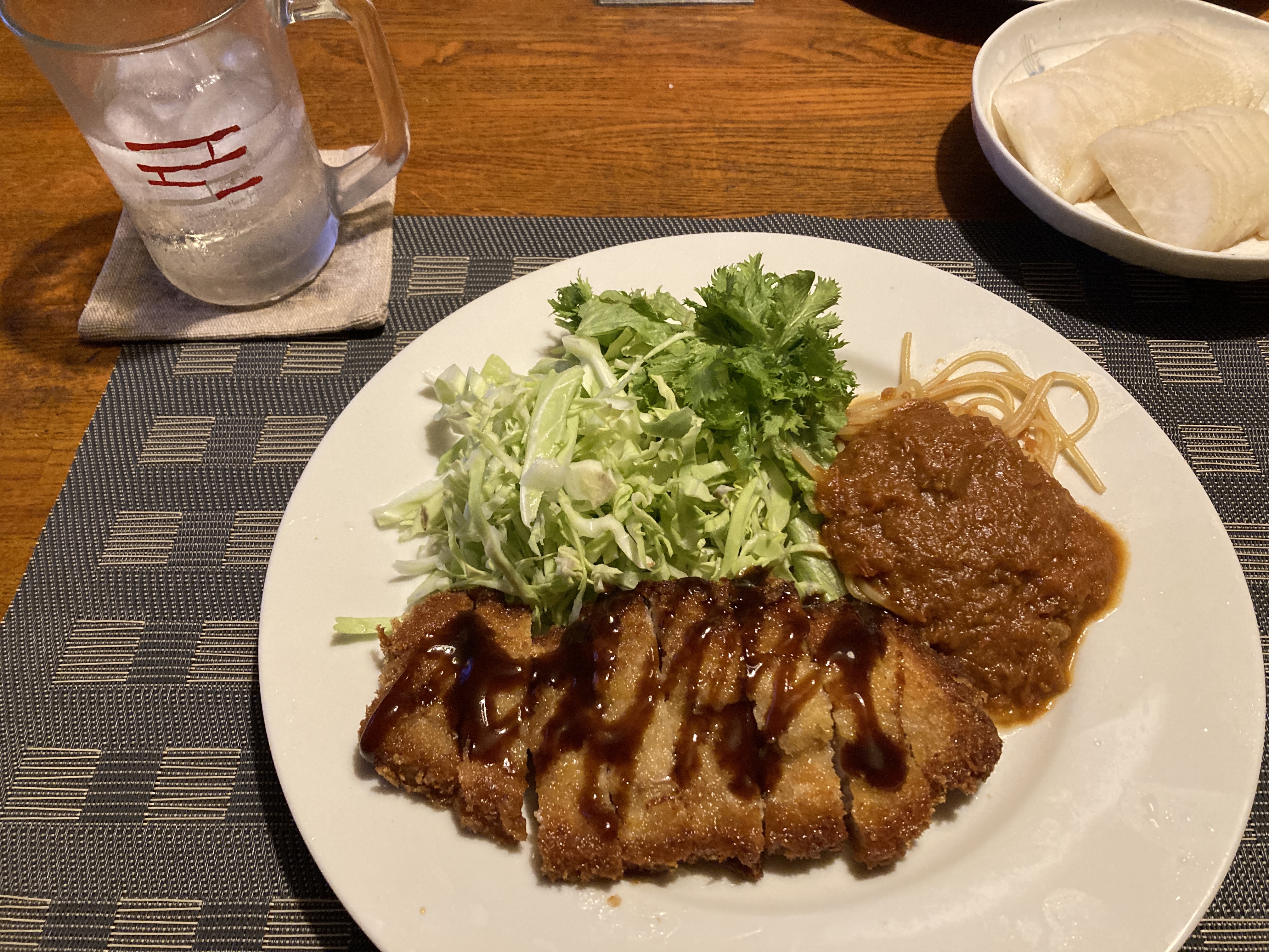 2024年1月25日blogyoko メニュー変更 大雪になりそうなので昨夜は相棒の車で 6時過ぎに帰宅です。 朝のうちに鶏肉を冷凍庫から出しておいた ので、アヒージョの準備開始。 の予定でしたが、何を勘違いしたのか 出しておいたのはひき肉。 急遽、冷凍庫からトンカツを出してメニュー 変更で〜す。