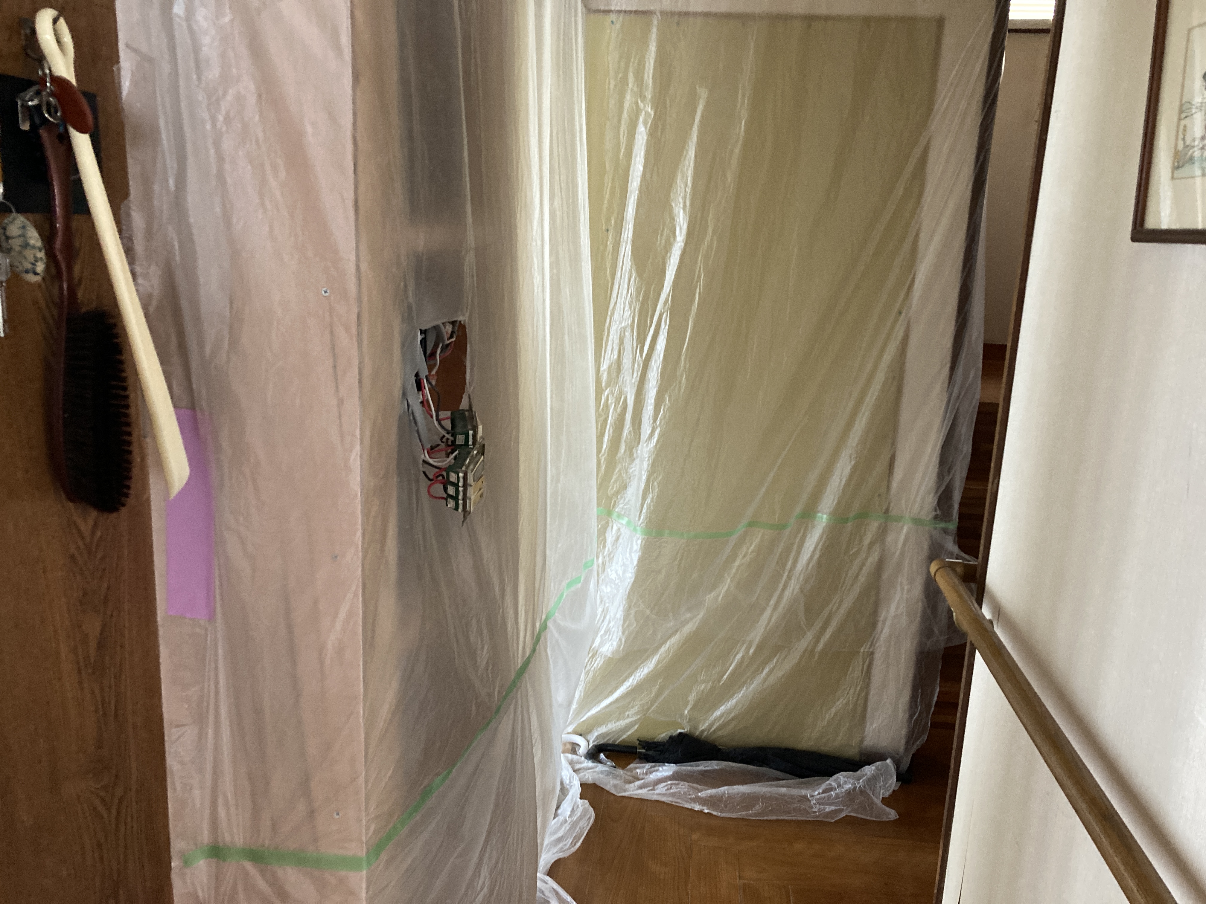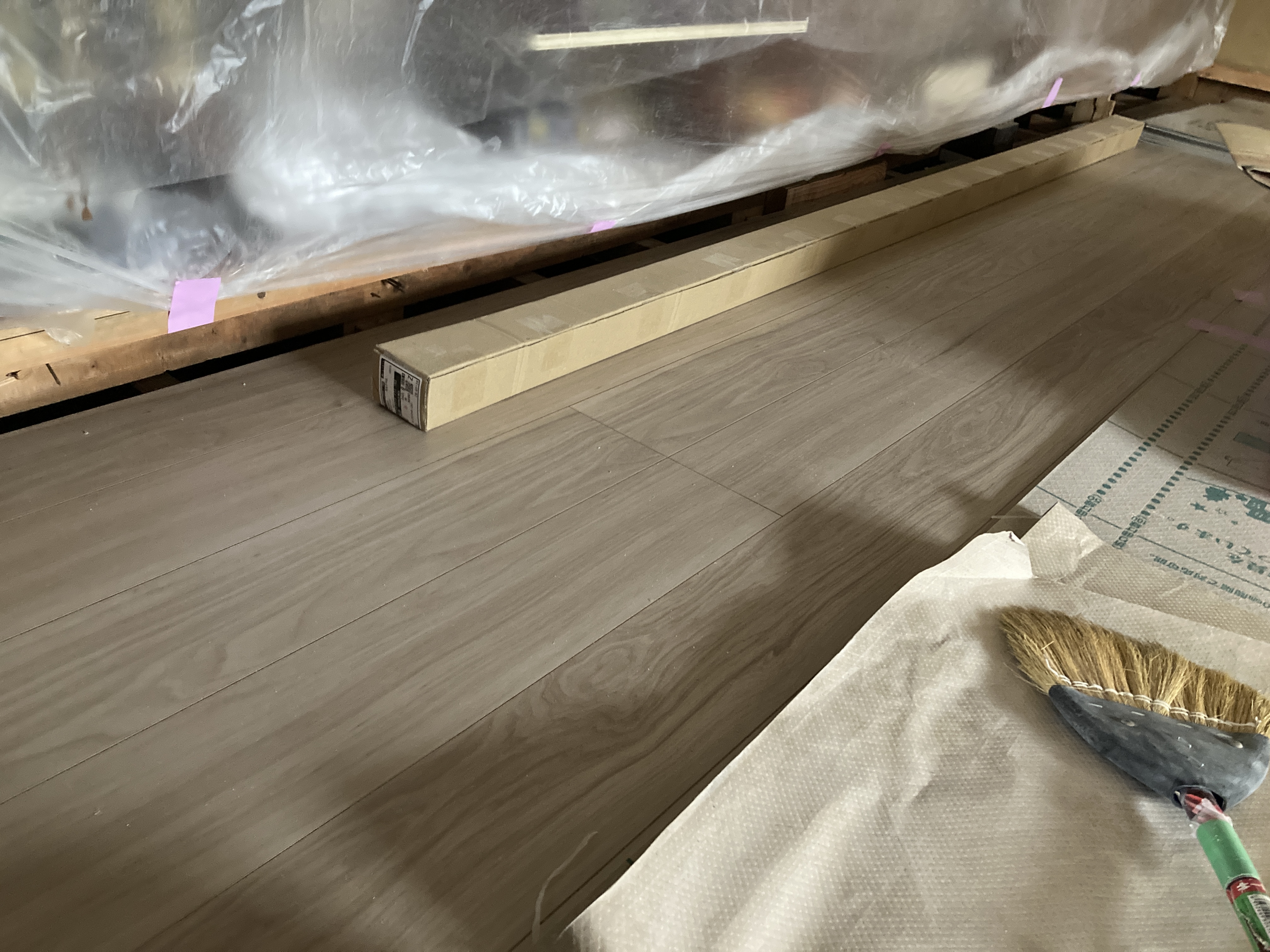 2024年1月25日blogyoko 暗い日々 和室から洋間になる部屋の床材が貼られました。 玄関脇の部屋の壁や天井のクロス貼りが 終わらないので電気のスイッチが剥き出し。 窓は封鎖、入り口も所々閉鎖で、我が家は 暗い日々を過ごしていま〜す。