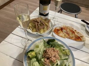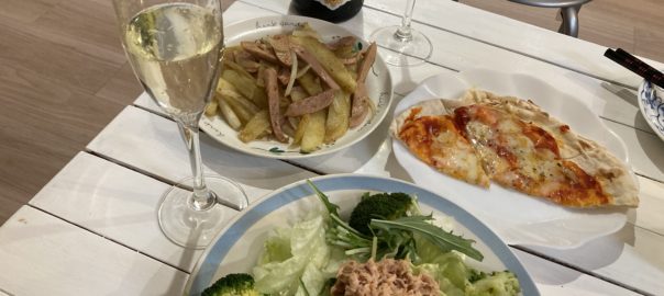 2024年2月26日blogyoko 早々に サラダとピザの夕食。 あとは相棒の好きなじゃがいもと玉ねぎ& ソーセージのカレー炒め。 冷たいシャンパンが美味しくて、また1本 飲み干しています。 外壁をいじっているので、今は1階では室内 アンテナでテレビ。 それもチャンネルがほとんどダメなので 早々に2階に避難で〜す。
