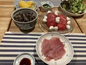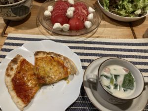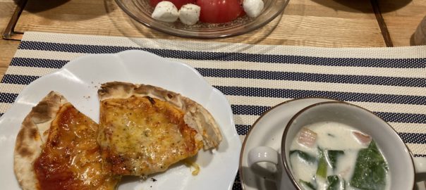 私はピザと青梗菜の葉とベーコンの牛乳スープを