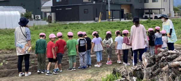 2024年6月5日blogyoko 様子見 畑から家に戻ろうとしたら、園児と先生が。 我が家の菜園の隣にさつま芋を幼稚園で 植えています。 苗を植える時期が遅かったようで、あまり 生長してないようですが、園児達が楽しみに している様子が伺えます。 これからちょくちょく様子見で〜す。
