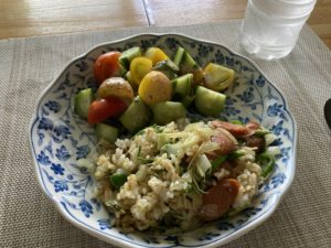 2024年8月1日blogyoko 野菜だらけ お昼はカレー味チャーハン。 自家菜園の野菜で野菜室がいっぱい! 押し込められ傷みそう野菜を全て 入れたので具材たっぷりです。 ついでにきゅうりやミニトマトも添えて。 ワンプレートに野菜だらけで〜す。