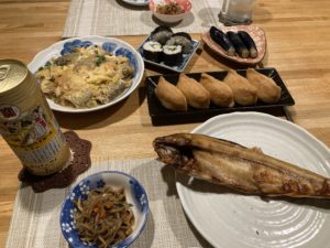 金曜の夕食はいなり寿司と干物の焼き魚。