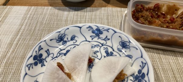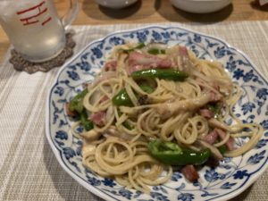 2024年10月27日blogyoko アルコールに お昼を食べすぎたので、夕食はつまみ程度。 生大根に南蛮味噌を挟んで。 う〜、アルコールに合う! 相棒は自分で作った牛すじの煮込みで。 でも、これだけでは小腹が空いて相棒から リクエスト。 ニンニクたっぷりのペペロンチーノ。 二人で一人分で〜す。