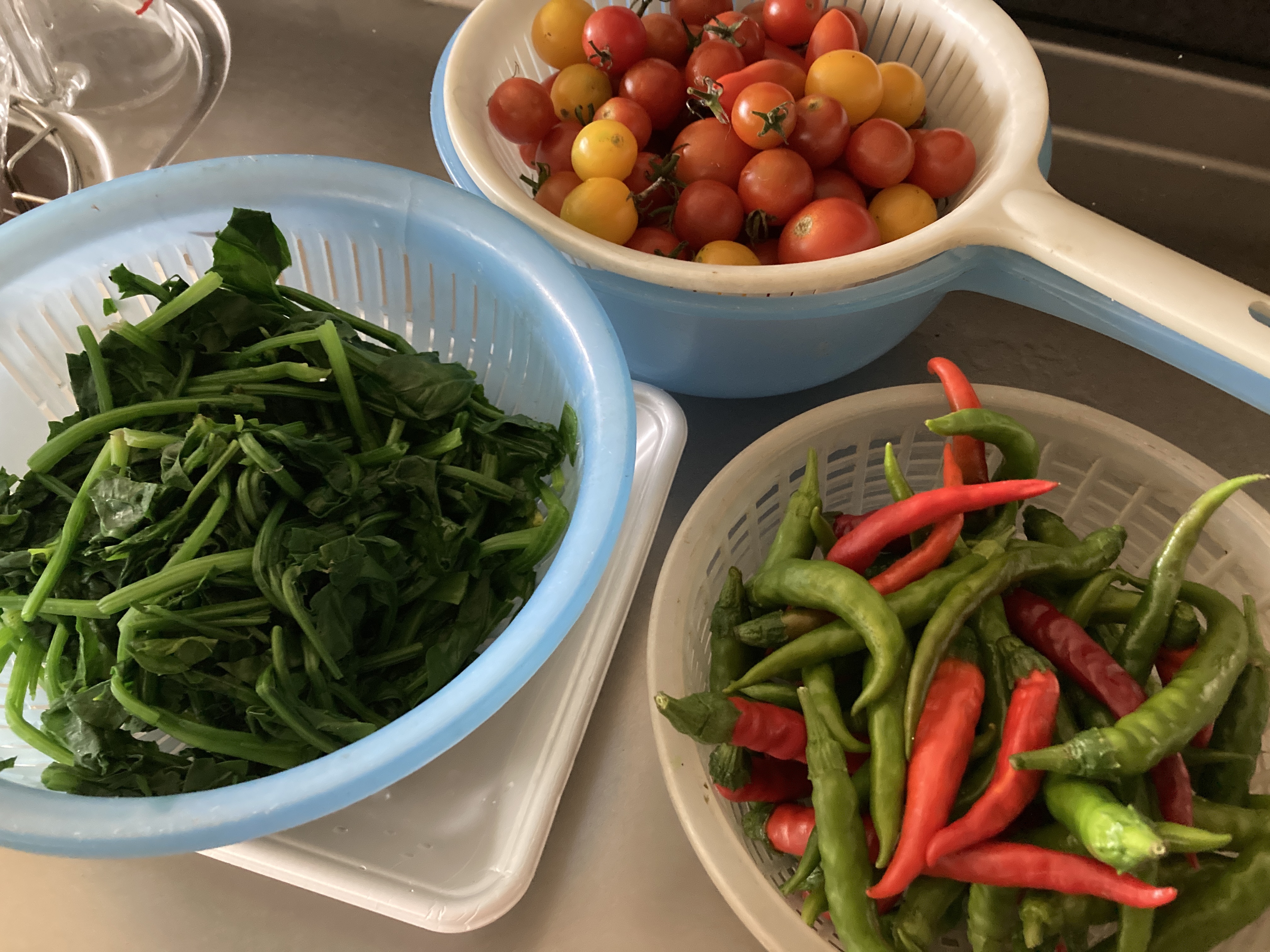 2024年10月27日blogyoko 自分用の 畑でミニトマトやほうれん草&もってほかの 収穫です。 午後から雨が降る予報なので、できるだけ 収穫してきました。 もってのほかはすでにバラして袋つめ。 ミニトマトももってもスタッフにお裾分け 予定です。 赤南蛮と青南蛮はこれから佃煮にしたり 味噌と合わせて調味して、自分用のお惣菜に なりま〜す。