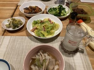 2025年2月3日blogyoko ちょこちょこ 金曜の夕食はキャベツのペペロンチーノと ブリとネギの甘辛煮&芋煮。 温かい芋煮から食べはじめたら、すでに 二人ともお腹いっぱいに。 でも、2時間ぐらいテレビを見ながら、 ちょこちょこ食べていたらいつの間に 完食で〜す。