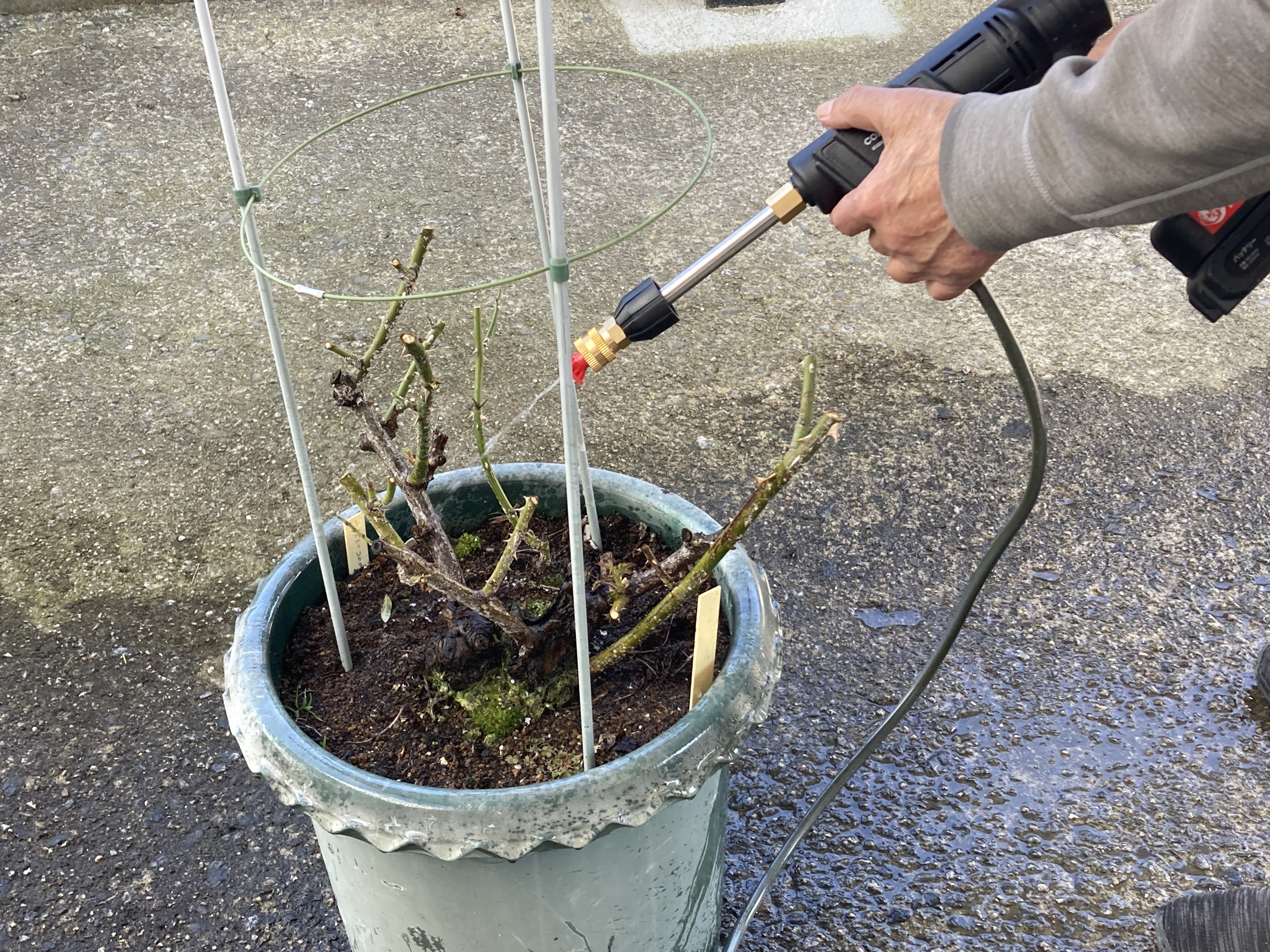 2025年3月24日blogyoko 雑用のフルコース お昼を食べたら、今度は鉢物についた害虫を 除去です。 最初はノズルの小さい方でしていましたが 中々うまくいかず、今度は高圧洗浄機を 出してきてやっていました。 水の勢いが全然違います。 ひと通り終わったら次は鉢植えです。 相棒、土曜は畑作業、日曜は雑用の フルコースで〜す。