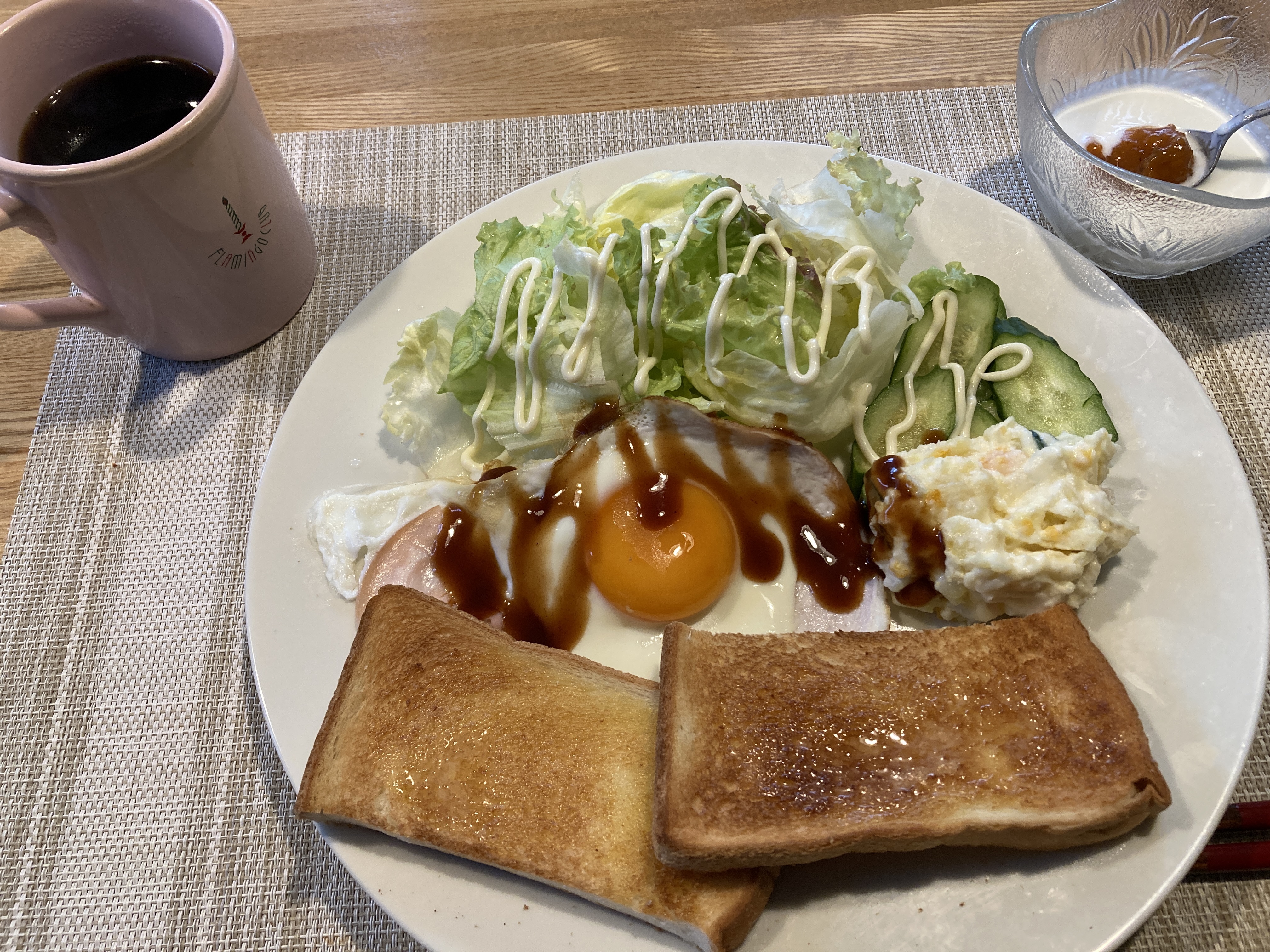 2025年3月13日blogyoko 意味ない 朝食はワンプレートのトースト。 いつもより量が多いです。 そして。相棒が淹れてくれるコーヒー。 今日は美容室の予約が11時過ぎ。 なのでお昼が取れないので朝のうちに お昼分も食べています。 でも、その後食べ過ぎてお腹を壊して いるので意味ないで〜す。