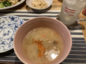 2025年3月28日blogyoko あら汁 夕食は前日購入の玉ねぎ揚げと回鍋肉。 そして、あら汁。 苦手なので私の分にはあらがほとんど 入っていません。 相棒にはたっぷり入っているのであら汁 だけでお腹一杯になってしまったようです。 回鍋肉は翌日へで〜す。