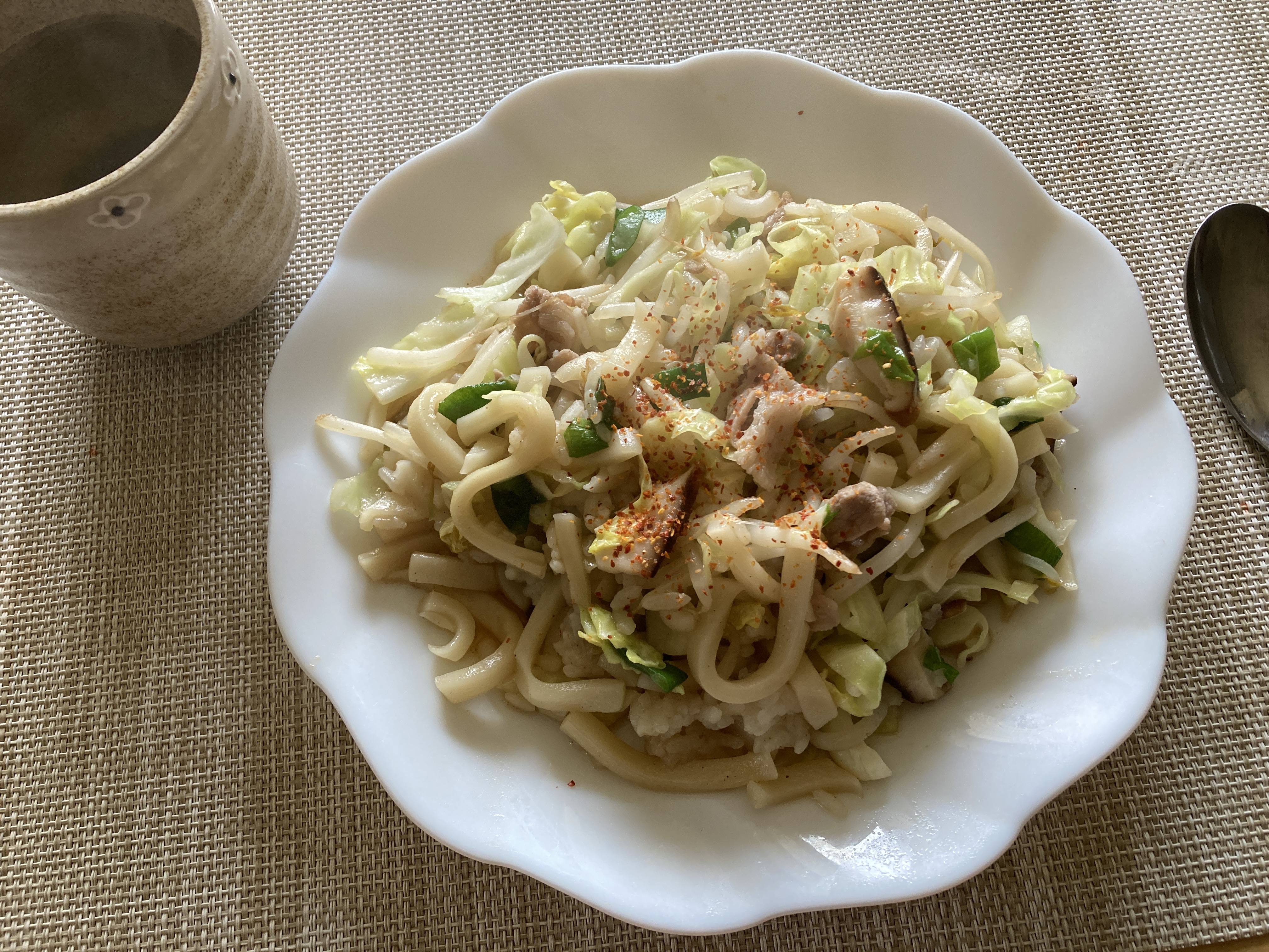 2025年3月26日blogyoko 在庫食品で うどん飯。 うどんが半分、ご飯がほんの少し残っていた のでそば飯のようにしてみました。 これはこれでまずまずです。 土曜の畑作業以来、筋肉痛が治らないので 家の外には一切出ていません。 在庫食品でお腹満たしてま〜す。