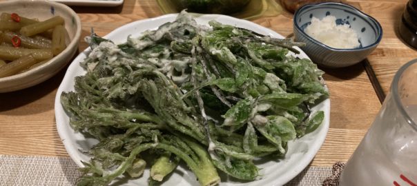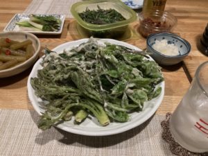 2025年4月28日blogyoko 山菜のオンパレード 土曜の夕食はたかせの産直から購入の山菜。 タラの芽、コシアブラ、ウドの葉の天ぷら、 葉わさびの醤油漬け、フキの煮物。 山菜のオンパレードで〜す。