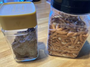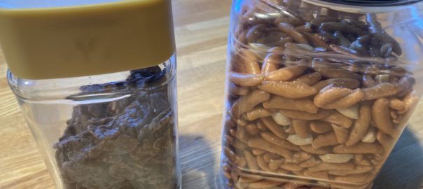2025年5月1日blogyoko つまみ喰い 重役退社の相棒が帰ると夕食の間まで どうしても口が寂しいようで色々な 袋を開けて、つまみ喰いするので 私にしたら、テーブルの上の袋が邪魔。 味海苔とコーヒーの入れ物に柿の種や チョコフレークを入れてみました。 早速、つまみ喰いで〜す。