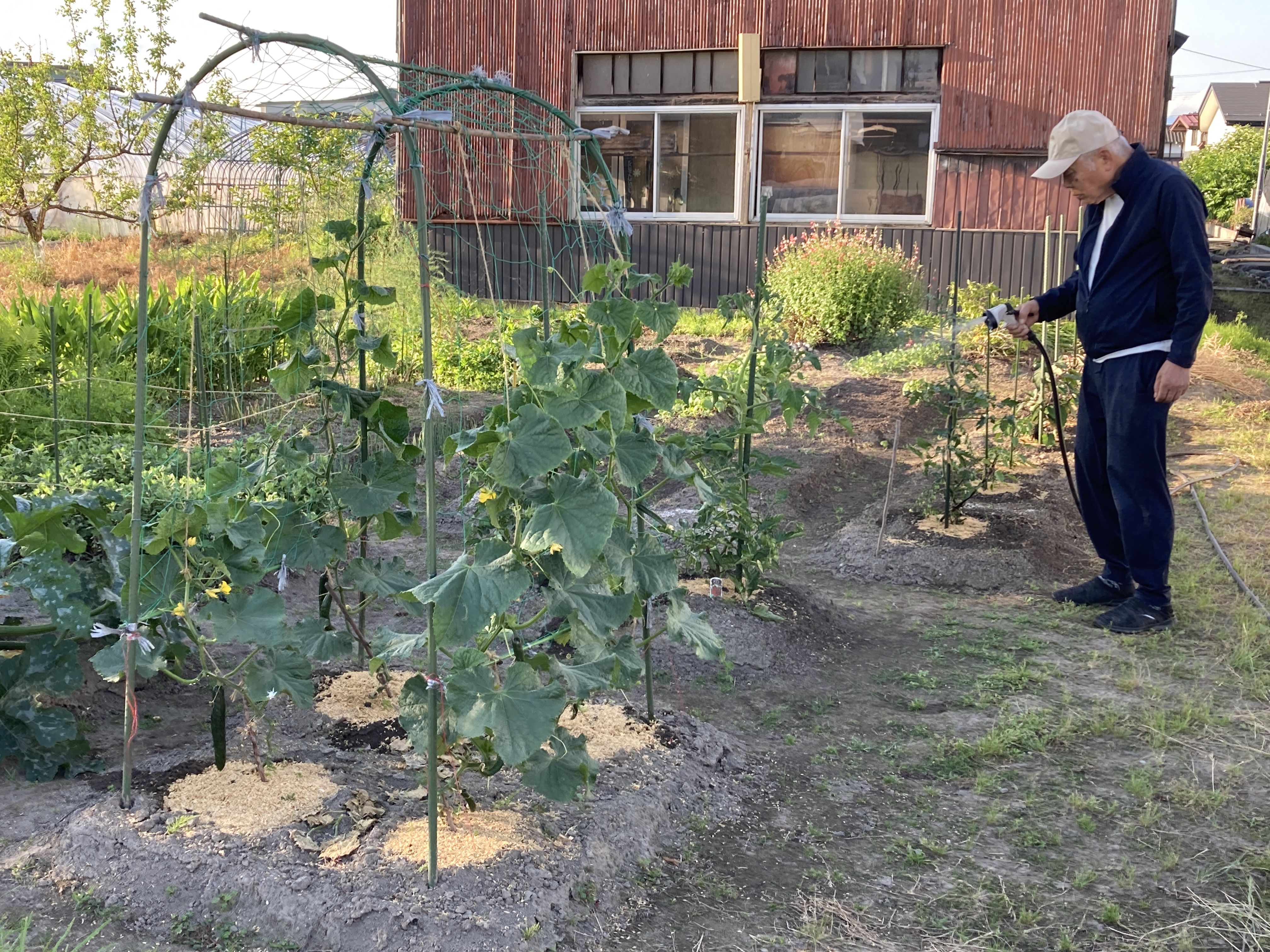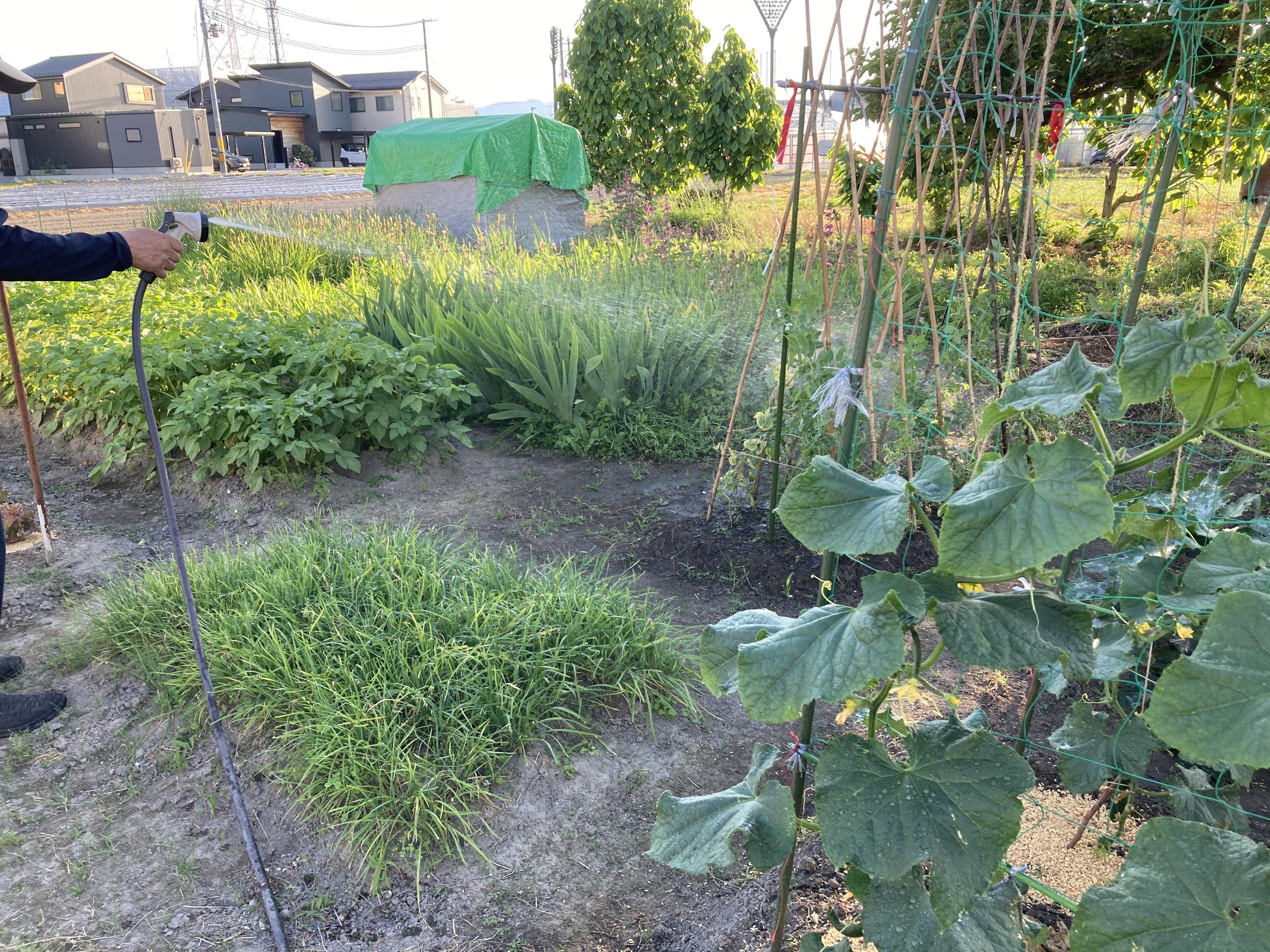 井戸水を借りてホースで水かけで〜す。