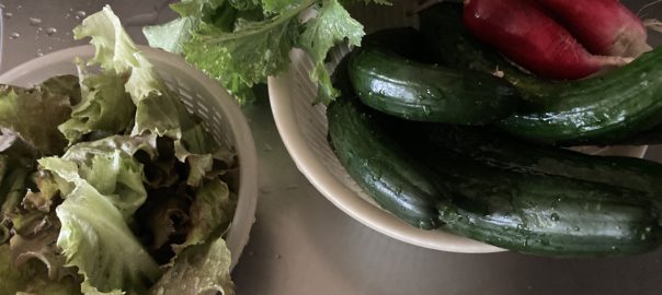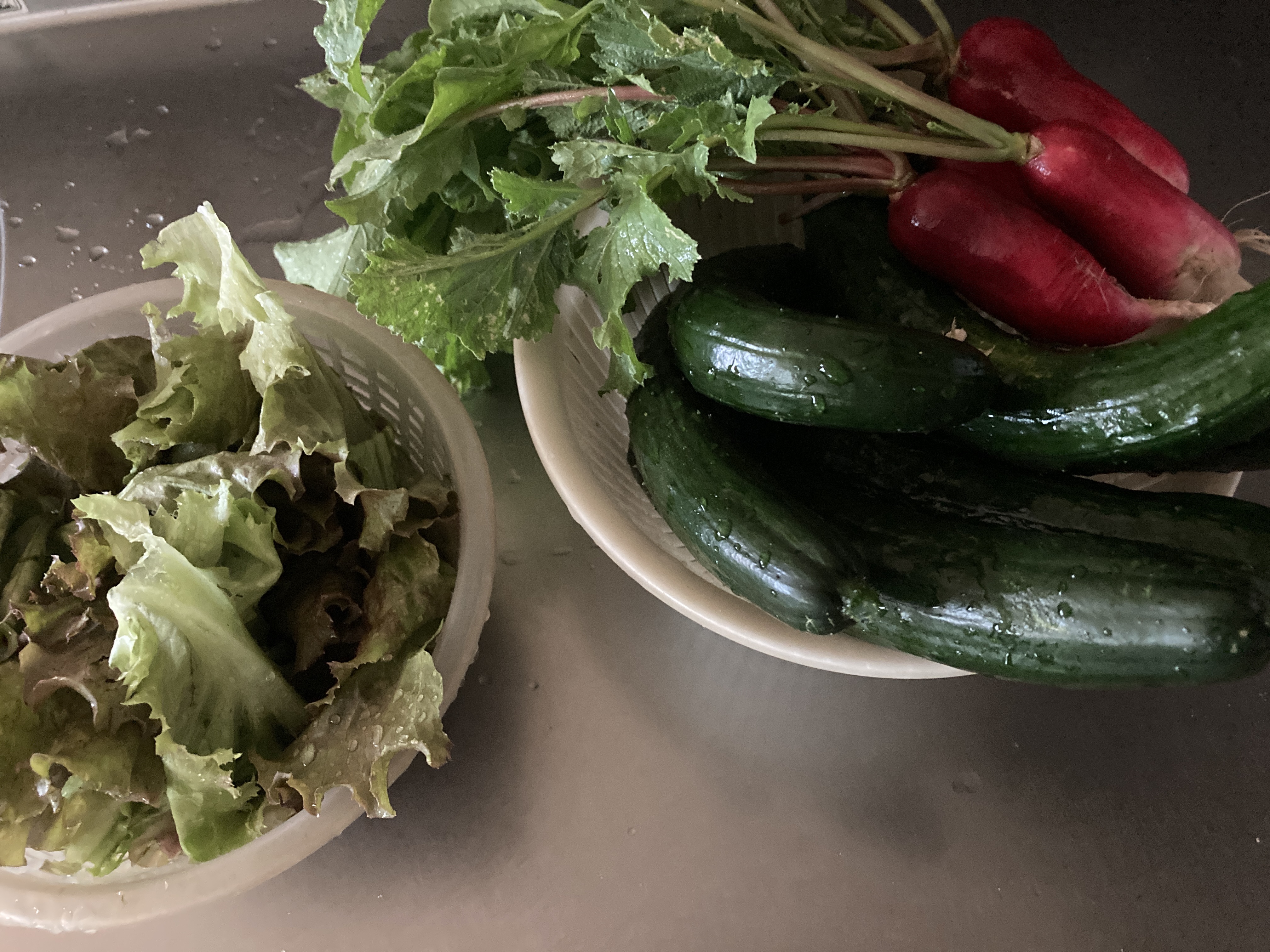 2025年6月20日blogyoko 相棒待ち まだ気温も高いのですが、相棒を七日町 まで送らなきゃならないので、その前に 畑へ水かけです。 きゅうり、二十日大根、スナップエンドウ サニーレタスを収穫して相棒待ちで〜す。