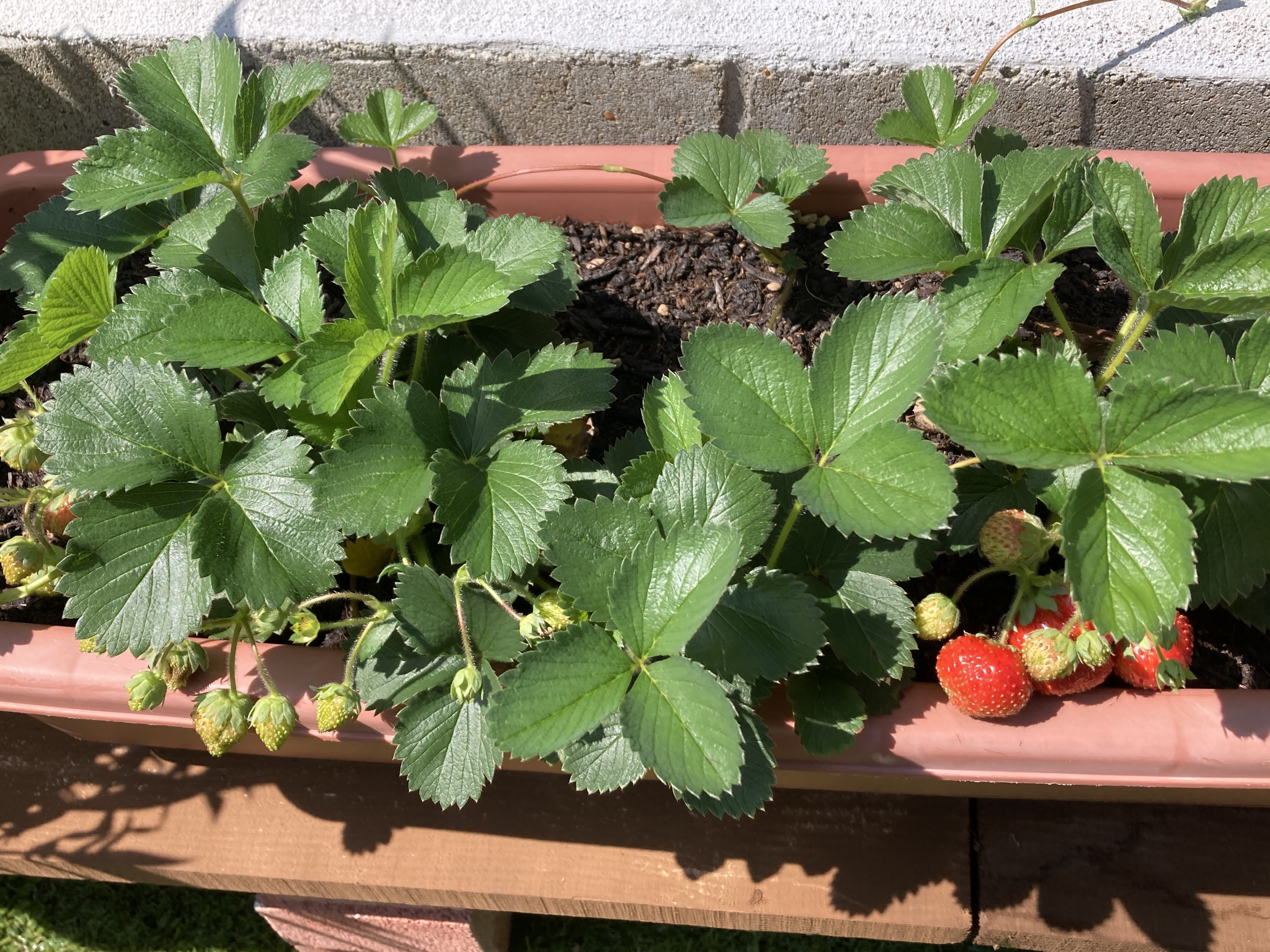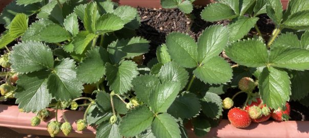 2025年6月29日blogyoko 二人とも まだ暑い時間帯ですが、二人とも畑が 気になり3時には畑作業開始です。 相棒は苗に高い支柱を立てたり、堰の中の 雑草を取ったり、私はずっと苗の周りの 雑草取り。 目処がついたところで雑草を集め、今度は 水かけです。 畑が終わると庭の鉢植えに水かけです。 苺が色づいてきました。 終わったのが7時近く、二人とも腰と太ももに 筋肉痛で〜す。
