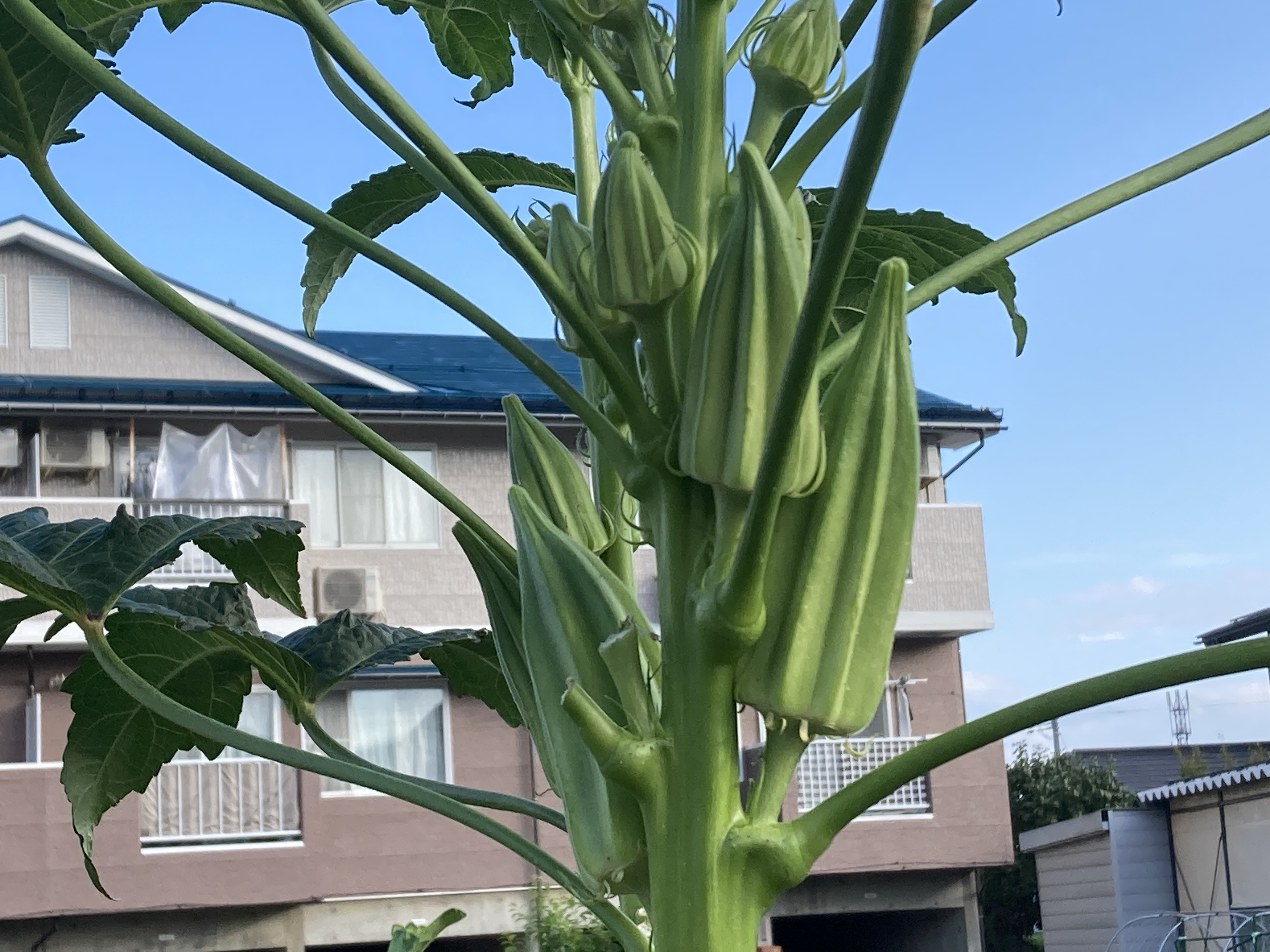 2025年8月30日blogyoko 手のひらサイズより 土手沿いを二人でテクテク。 風が気持ちいいです。 普段通ったことのない住宅地でびっくりサイズの オクラを見つけました。 品種が違うんでしょうね。 手のひらサイズより大きいかもで〜す。