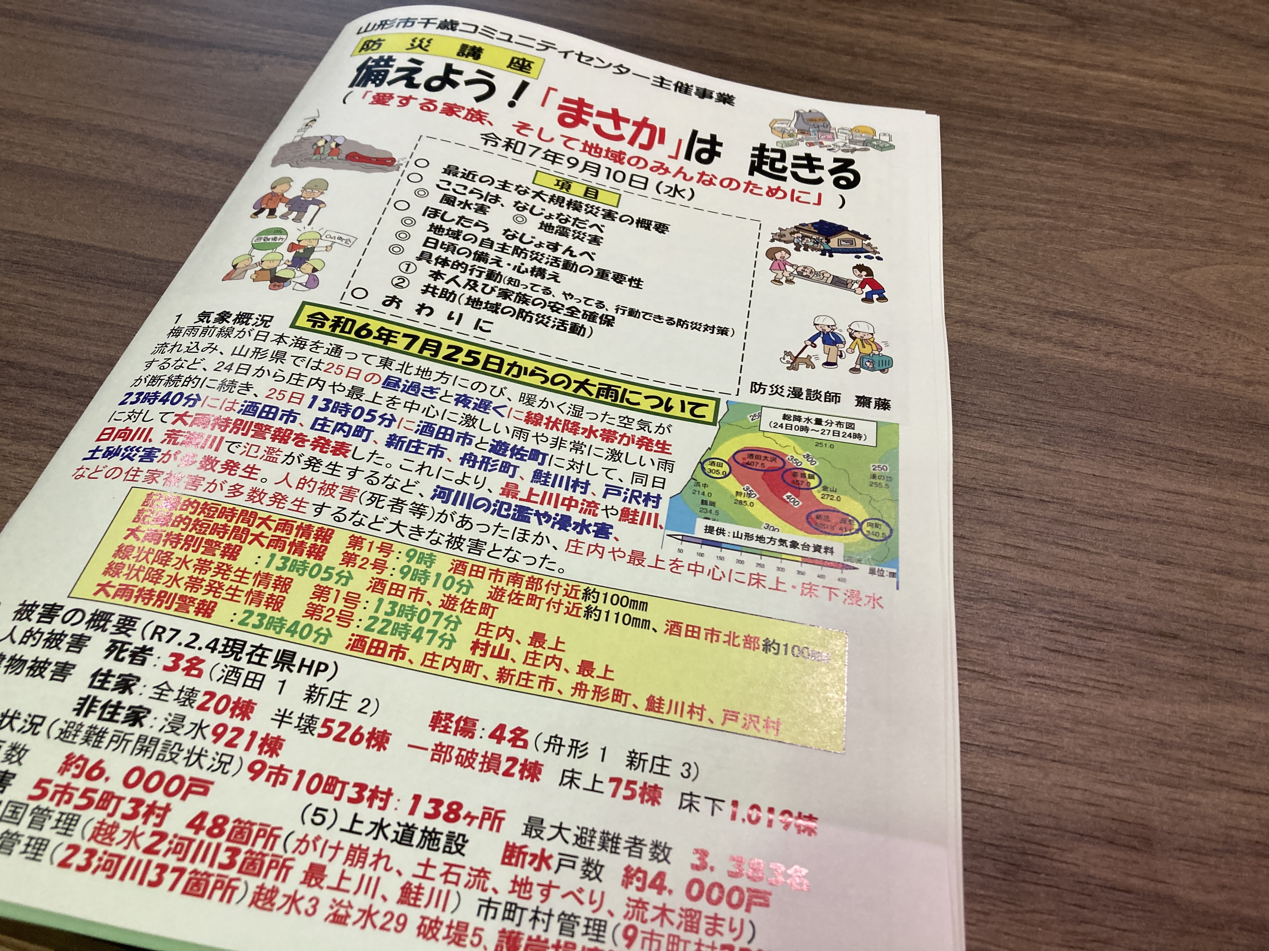 2025年9月11日blogyoko 失態 6時半から二人でコミセンで防災講座。 お話しされる方が置賜の方なので、所々 方言でわからない事もありましたが、8時 過ぎまで、あっという間の時間でした。 今は何かと災害が多いので、備えや 心構えが大事。 わかっているつもりでも勉強になりました。 あと少しのところで私の携帯音が。 失態で〜す。