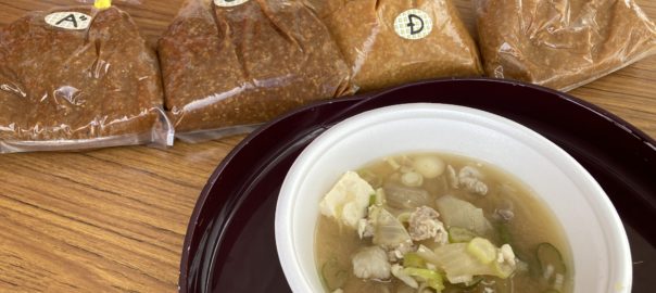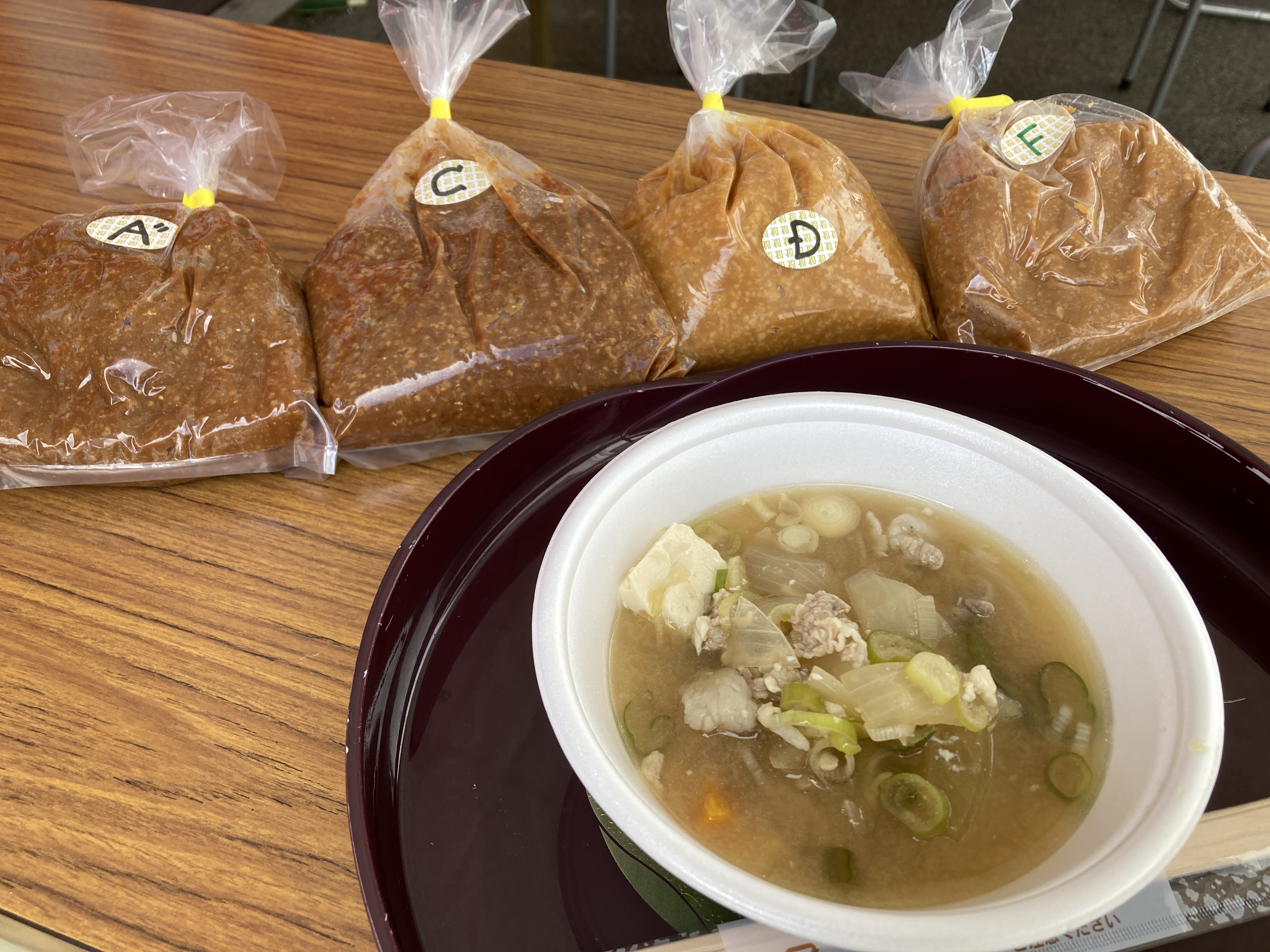 2025年9月24日blogyoko 味噌祭り 今度はカネチョウ味噌さんへ。 味噌祭りを開催です。 味噌の味見をして購入です。 ついでにお昼だったのでおにぎりと豚汁をと 思ったら、すでに売り切れ。 従業員の賄い用をご馳走になりました。 印役のお祭りの日に合わせての開催と聞いた ので、そのまま印役の神社へ行く事に。