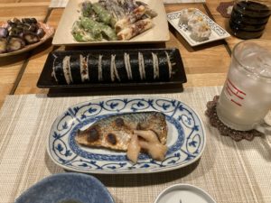 2025年9月22日blogyoko 勿体無い 塩アジとキンパ&茄子と万願寺、竹輪の 天ぷらの夕食です。 毎日、茄子と万願寺が何かしらの料理で テーブルに並ぶので、相棒、完全に 嫌気が出ている様子ですが、私は勿体無い 精神で食べ続けていま〜す。