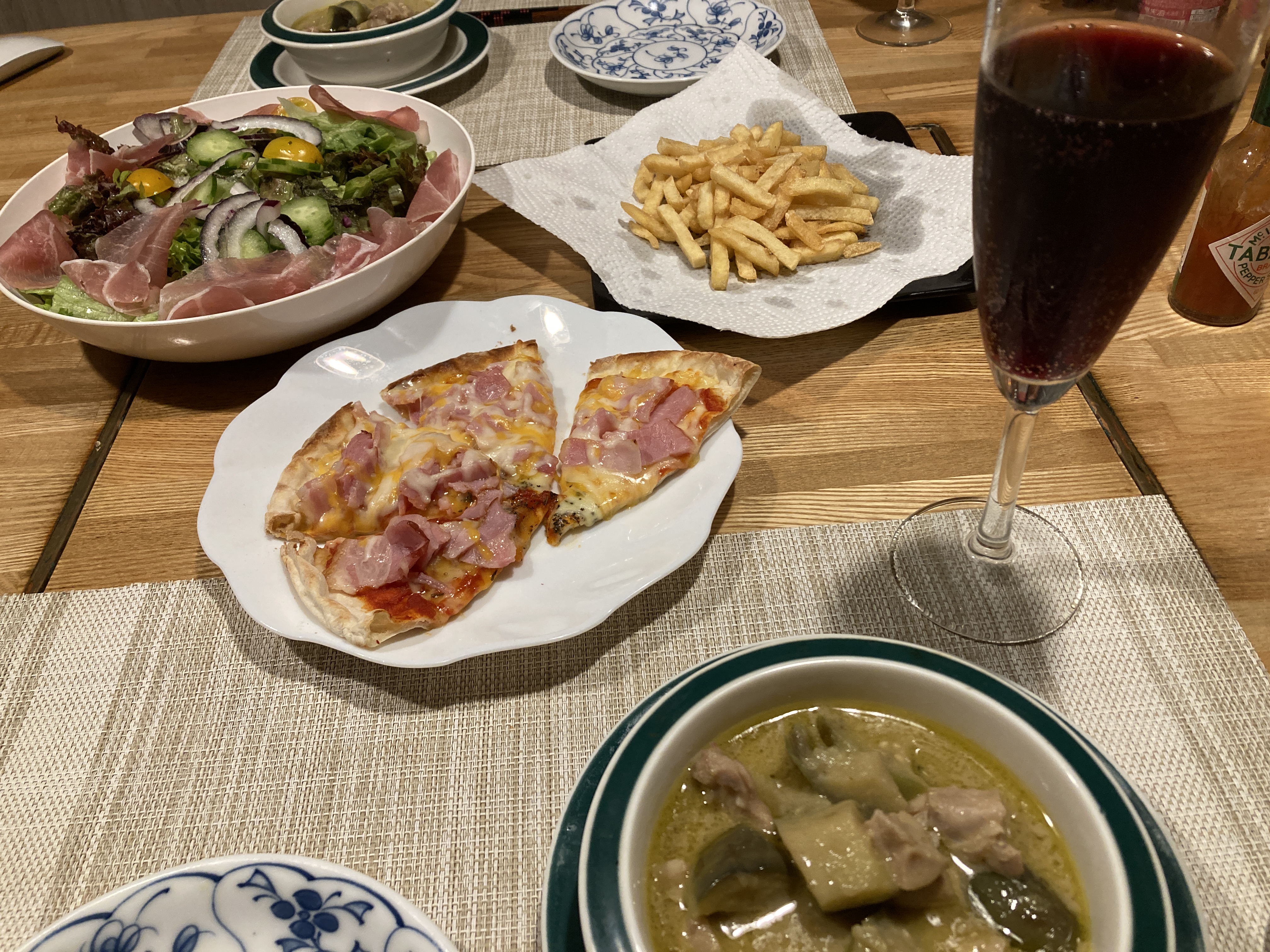 2025年9月21日blogyoko 我慢 ピザとグリーンカレー&フライドポテトの 夕食です。 スパークリングの飲み口が良いので、 もう1本飲みたかったのですが、 昔のドラマが酔いが回って見れなく なりそうなので我慢で〜す。