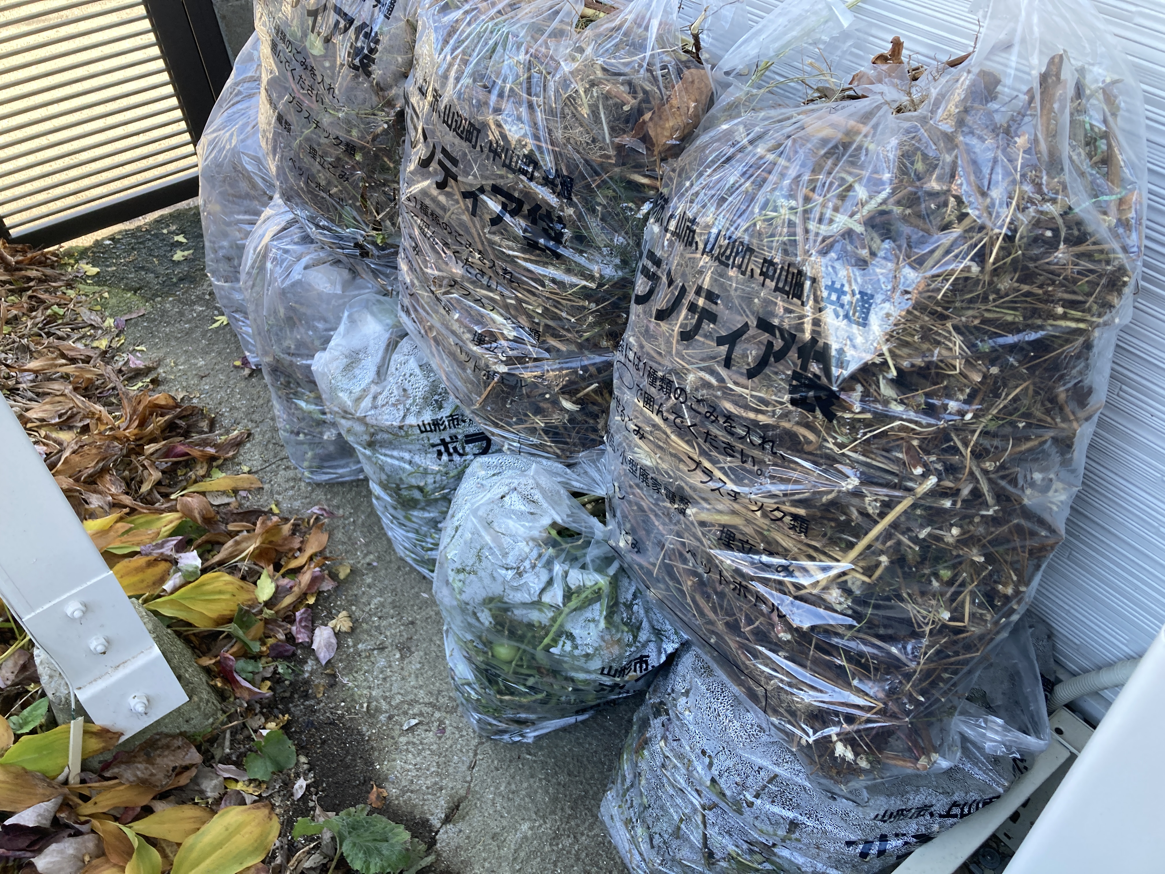 2025年11月17日blogyoko 片付け 日曜の午前中も相棒は畑の枯れ枝の片付け。 私は前日タイヤ交換してもらったので 空気圧を見てもらおうとスタンドへ。 今は空気圧もセルフになっていて行列です。 私は初めてだったのでスタッフから聞きながら 挑戦です。 スタンドから戻ってきても畑の片付け終わらず 汚れていい服に着替え、私も手伝い。 前日は5袋、昨日は3袋で〜す。
