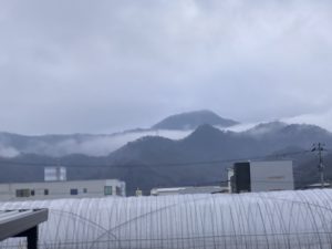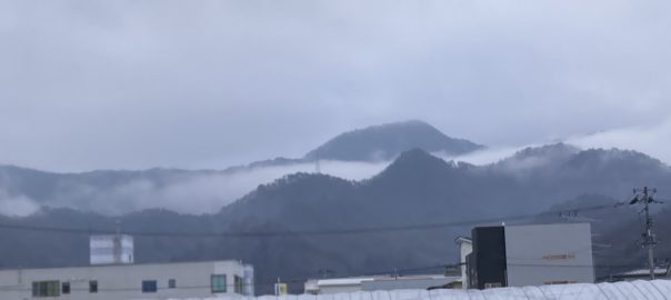 朝食時に窓から見えた山と山の間の雲。