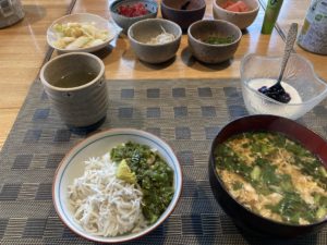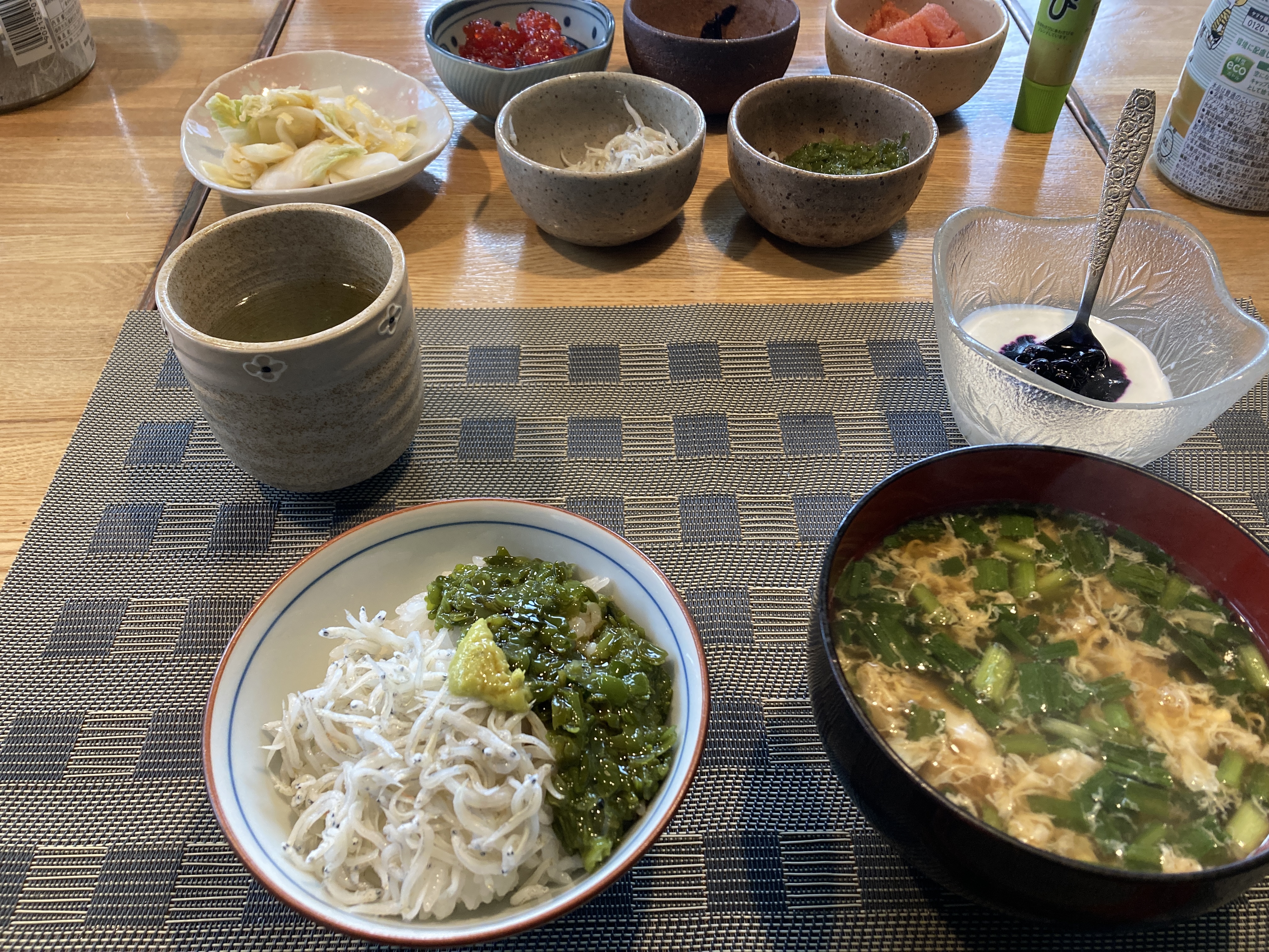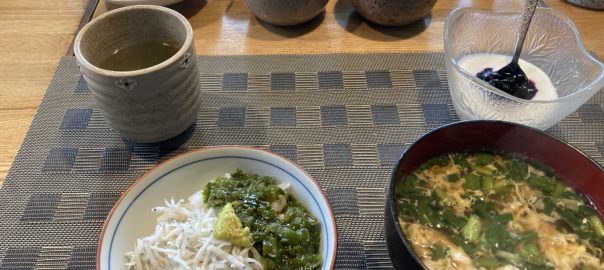 2026年3月12日blogyoko 賑やかに しらすとメカブで朝食です。 魚嫌いの私でも釜揚げしらすは大好き。 ワサビと醤油かけてズルズルと頂きます。 小鉢に色々盛られている中から、相棒は 筋子や昆布の佃煮を。 二人だけなのに賑やかに食べていま〜す。