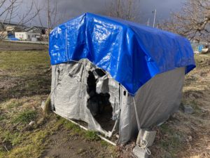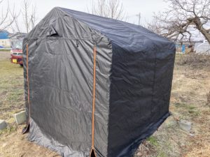 2026年3月23日blogyoko 完成 破れてしまった農作業用道具を入れていた テントです。 相棒から骨組みができたとラインが入り テントをかぶせに畑へ。 腰を曲げてゆっくりテクテク。 テントをかぶせたら、また私は安静。 風で飛ばないように残りの作業も相棒一人で。 どうにか完成で〜す。