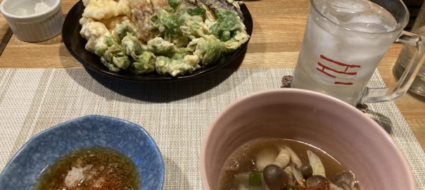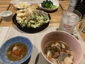 夕食はふきのとう等で天ぷらと芋煮。