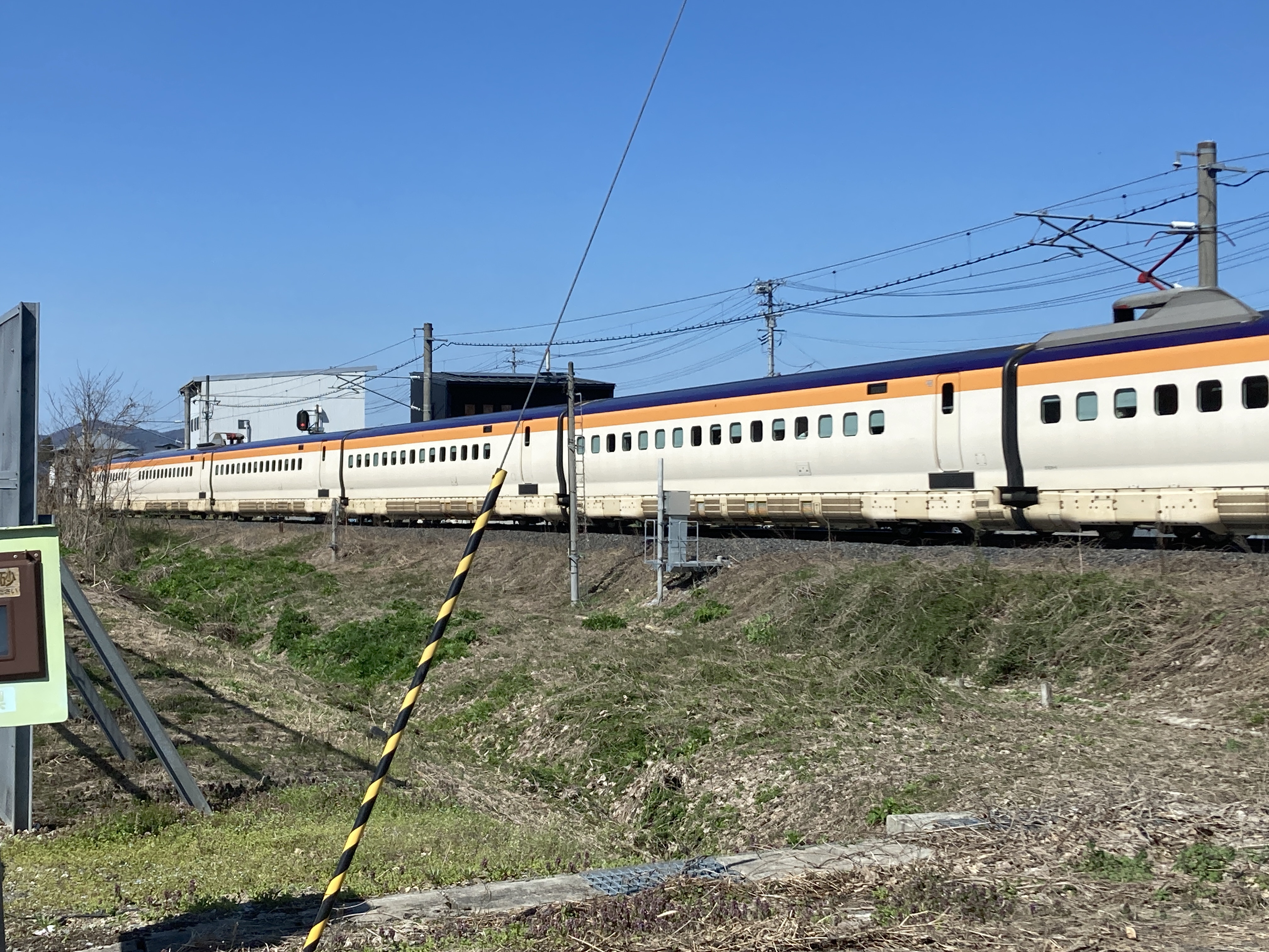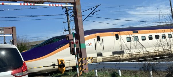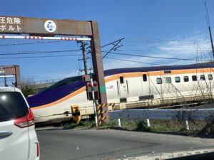踏切で止まると新幹線が通過です。